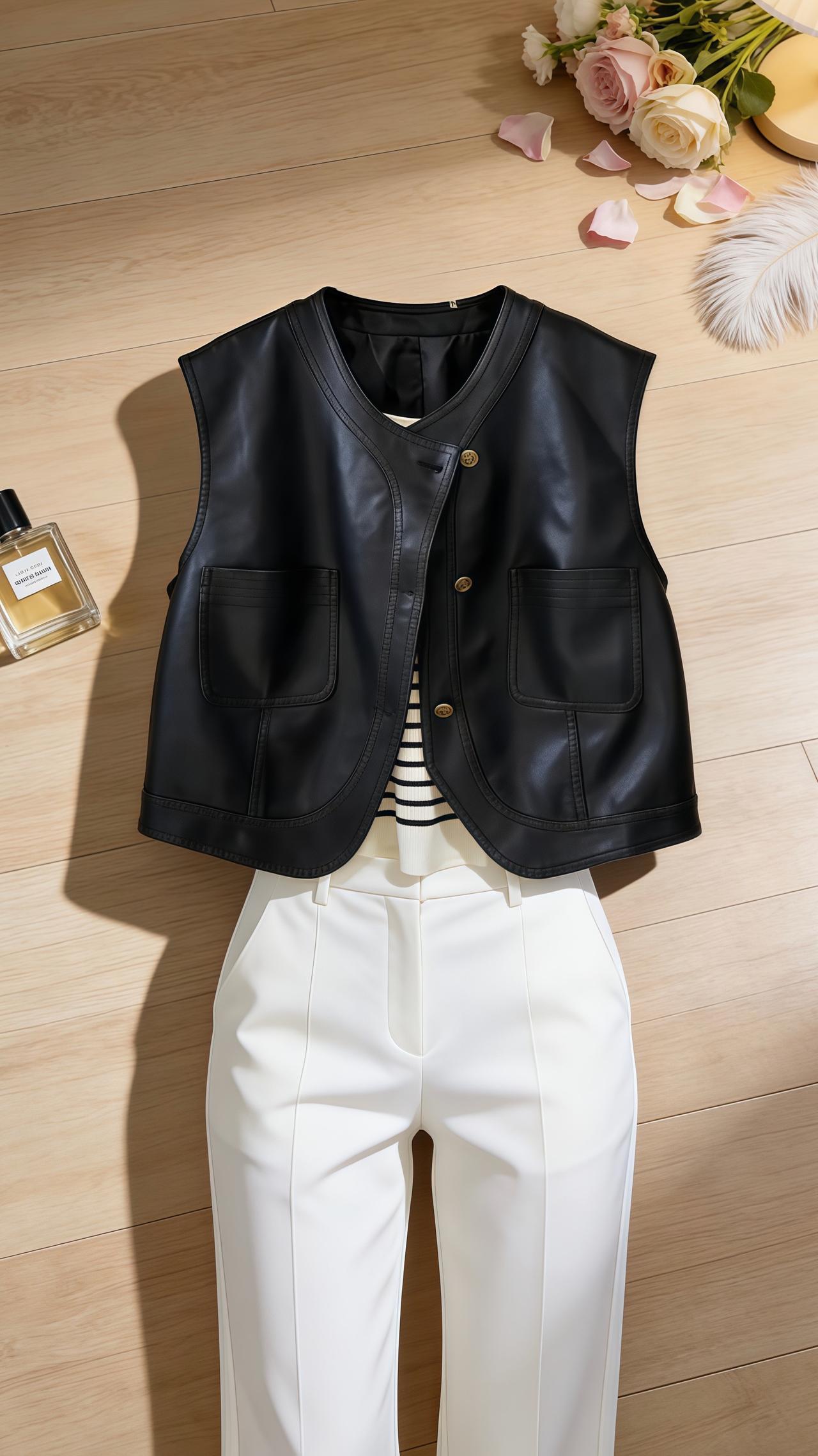 这套是松弛优雅通勤风,核心是浅灰短袖针织+黑长开叉裙的搭配:宽松针织自带松弛感,