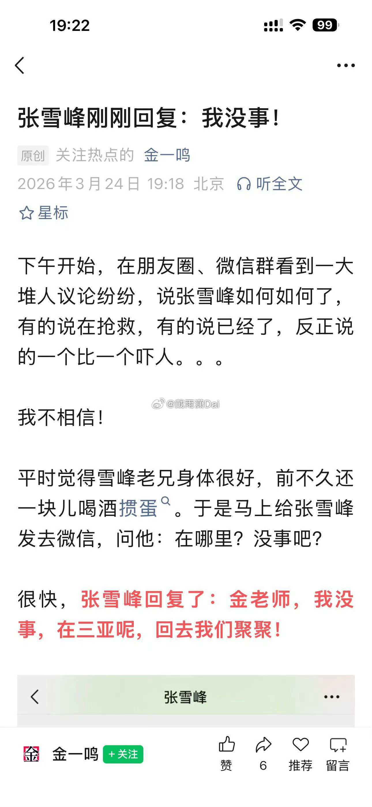昨天,账号「金一鸣」发文《张雪峰刚刚回复:我没事!》,标题十分吸引人,点进去才知道,正文引用的是个同名同姓的张雪峰律师,与刚逝世的考研张雪峰老师并无关联。