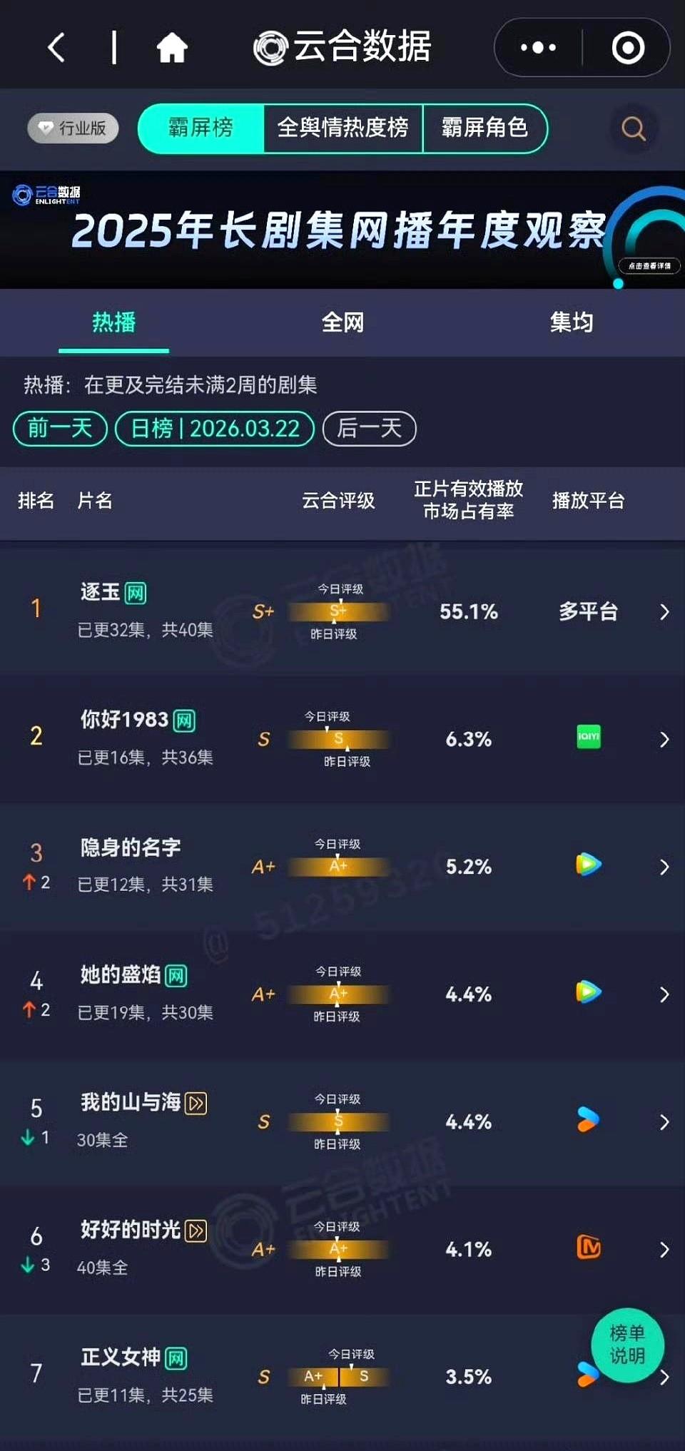 最近刷了几个《逐玉》的切片,有点惊到! 这剧数据也太猛了,云合市占率干到55.1%,直接把《庆余年2》给超了,仅次于《狂飙》。腾讯爱奇艺双平台热度全破万,这在联播剧里还是头一回。 我本来是冲着田曦薇和张凌赫去看的,结果被男二女二的CP线给迷住了。尤其是男二,那种真心错付的感觉,看得人好心疼。 说实话,我好像一直都特别容易共情这种有点“反派”或悲情色彩的角色,不知道有没有人跟我一样? 这剧全员都值得一个好发展,这波数据确实是现象级爆款了。
