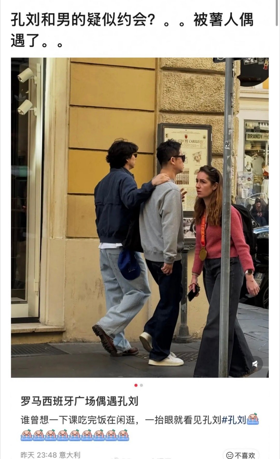 西班牙偶遇孔刘与男子搭肩散步 网友在西班牙街头偶遇孔刘与男子搭肩散步,网友总能看