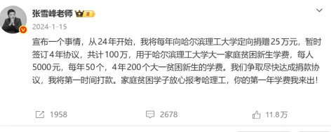 张雪峰捐款千万资助贫困学生郑州大学(母校):2024年起,每年定向捐赠50万元,连续6年共300万元,用于资助大一贫困新生学费,每人5000元。