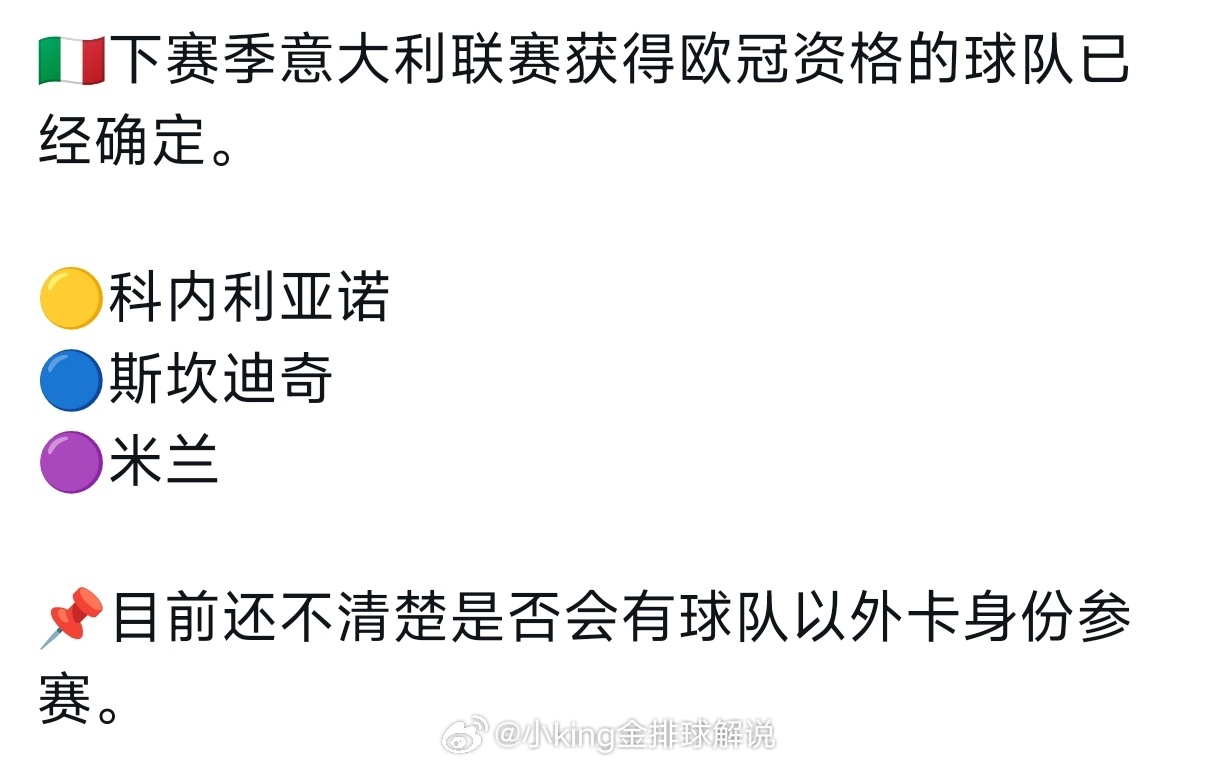 意大利联赛的下赛季欧冠参赛资格队伍确定意甲队伍资格确定规则:联赛冠亚军+常规赛成绩最好的队伍。世界排坛资讯