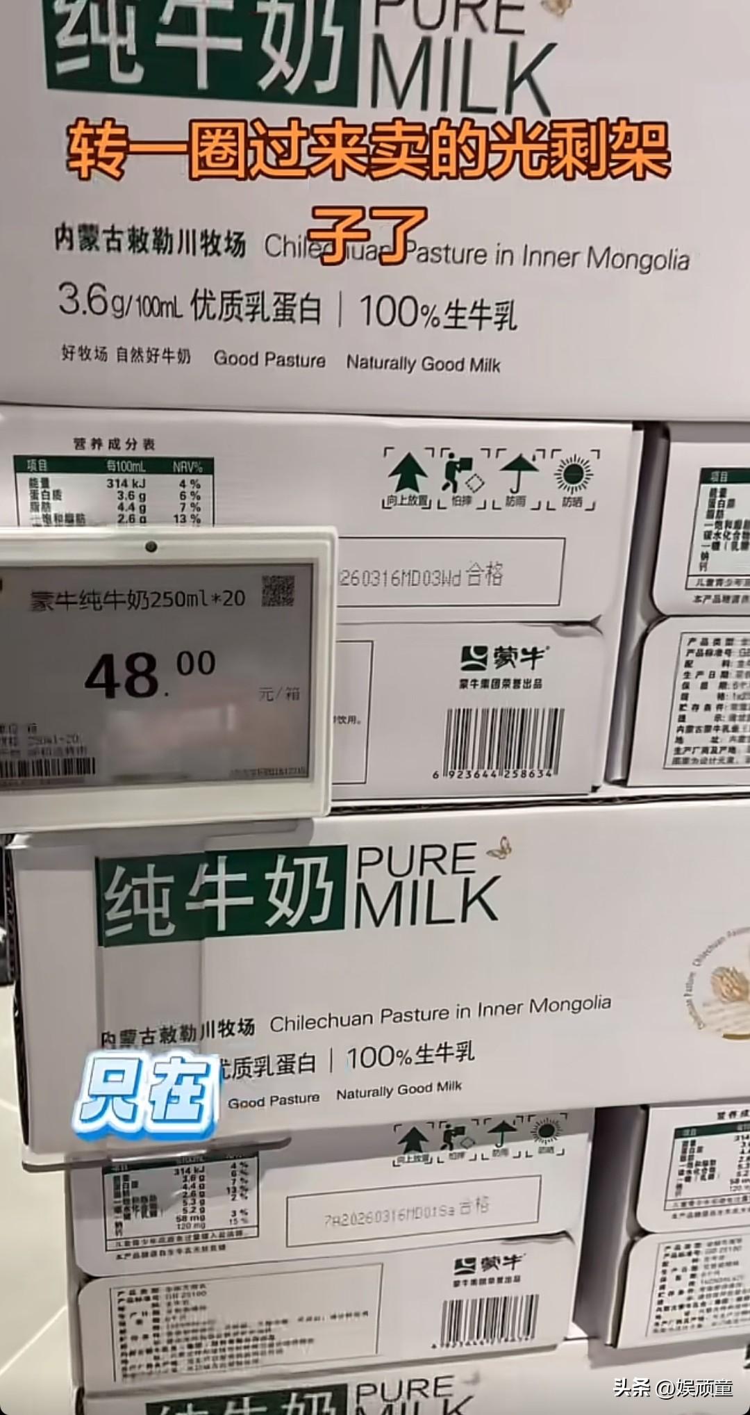 当超市足够强势时,消费者便能获得实惠,以低价购得优质商品。就拿胖东来来说,其售卖的蒙牛纯牛奶,每瓶250ml,每箱20盒,售价仅48元。 每100ml牛奶的蛋白质含量达3.6克,钙含量为120mg,这与特仑苏不相上下。 牛奶生产地是敕勒川牧场,你在其它超市买的牛奶,即便是特仑苏,也不是这个牧场产。 这就是胖东来的议价能力,大品牌也会折腰。