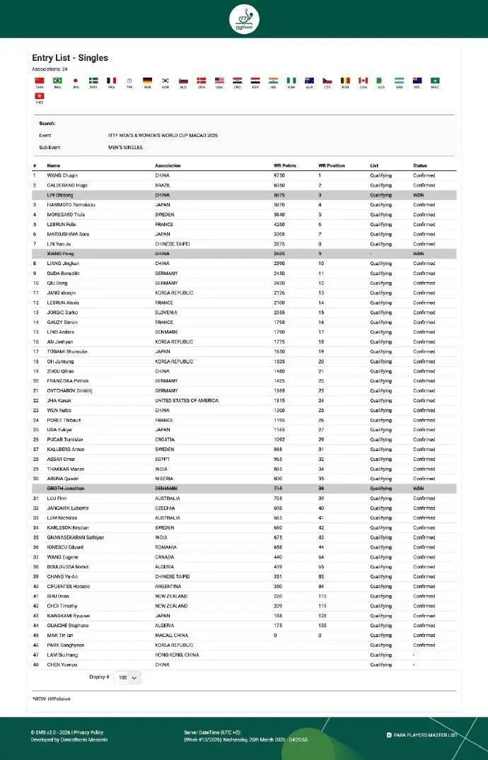 林诗栋退赛不到24小时, 澳门世界杯再次传来退赛消息, 丹麦名将格罗特突然宣布退出本次澳门世界杯, 由国乒小将陈垣宇替补参赛, 原本以为陈垣宇会替补林诗栋参赛, 没想到这个名额落到了中国香港选手林兆恒头上, 林兆恒作为亚洲杯四强选手, 率先拿到这个替补资格, 陈垣宇的加入极大缓解了王楚钦的夺冠压力, 从新加坡大满贯到重庆冠军赛, 陈垣宇的表现可谓是非常亮眼, 爆冷击败世界冠军雨果, 充分展示出打外协的超强心态, 面对世界第二的莫雷加德, 敢打敢拼,勇于在绝境下上演逆转, 另外值得期待的就是小将温瑞博, 能否延续冠军赛的火热状态, 再次上演惊天逆转, 成为世界杯的最大黑马