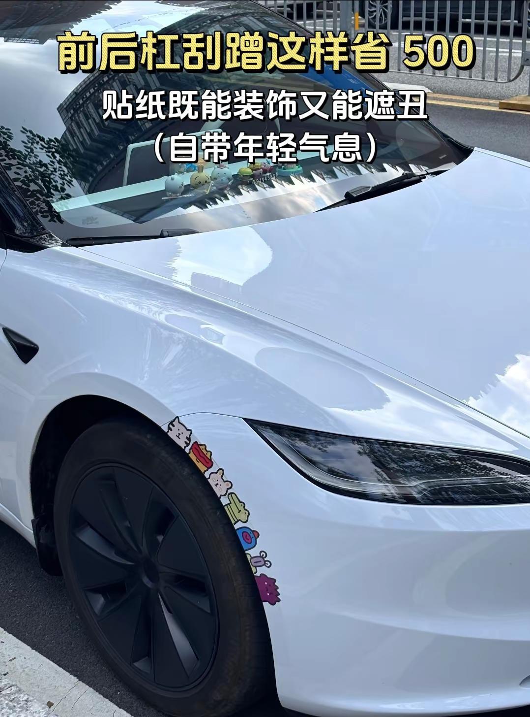 前后杠刮蹭这样省 500。前后杠为塑料材质,也是经常会刮蹭的地方,不修也不会生锈,修一次 500,没必要,最好就用几元的贴纸覆盖,不仅能遮盖刮蹭,车子也一下有了年轻气息。汽车外观本身是工业化流水线产品,并不具备个性化,贴纸意外让单调的外观多了一些个性化元素,有人选择可爱贴纸,外人就会联想车主是一个可爱的人,选择酷炫的贴纸,外人就会联想车主是一个很酷是人。你会选择哪一类贴纸呢?漆划痕 刮蹭 用车知识 前后杠 车
