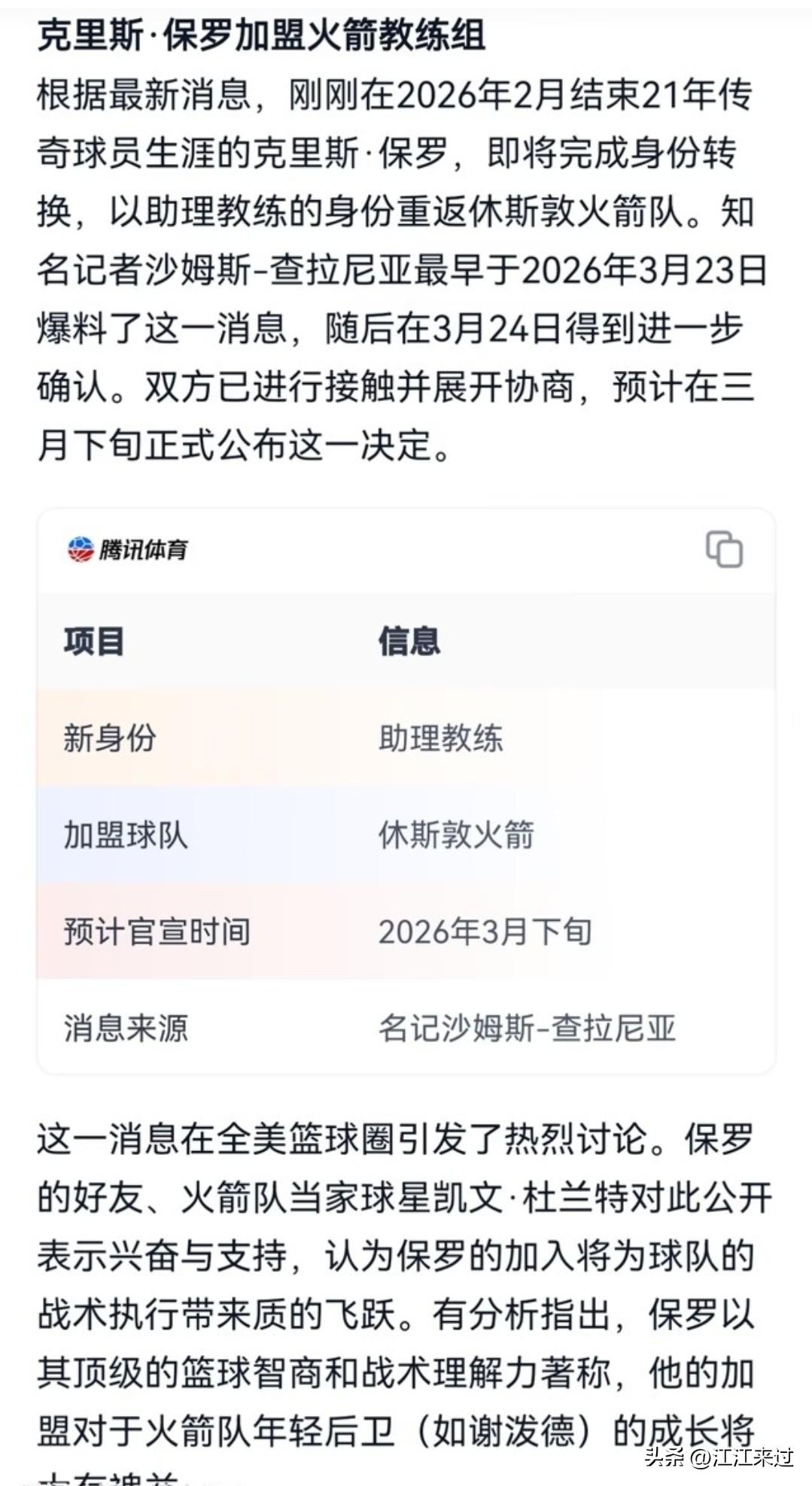 克里斯保罗正式加盟火箭,乌杜卡帅位不保!火箭终究还是动手了,火箭管理层终于忍受不了乌杜卡让杜兰特打控球后卫! 保罗将以助教的身份加入火箭,静待官宣!主要任务是培养谢泼德,帮助其快速成长! 保罗拥有顶级的篮球智商,能充分的理解战略战术,他的加盟会将火箭的进攻体系梳理的更加流畅! 太完美了,这个操作说不定是解决火箭现在的问题最好最简单和最廉价方案! 当初火箭管理层有意将哈登招至乌杜卡麾下,被当时如日中天,状态正盛的火箭主教练乌杜卡一票否决了! 现如今,火箭的进攻体系明显出现了问题,杜兰特对于他在球队的定位也极度不满,乌杜卡已经掌控不了目前的局势了! 火箭会不会效仿湖人队的雷迪克,保罗篮球智商可是比雷迪克高出不止一个档次! 恭喜保罗刚退役就进教练组,保罗篮球智商那是天花板级别的,战术理解力绝对在线。 勇士库里现在还在打球呢,保罗领袖气质没得说,但执教这块儿还没开始练。真要比的话,保罗现在确实更接近教练角色,毕竟人家已经上手了!不过库里的篮球脑子也不差,以后转型教练肯定也有一套。