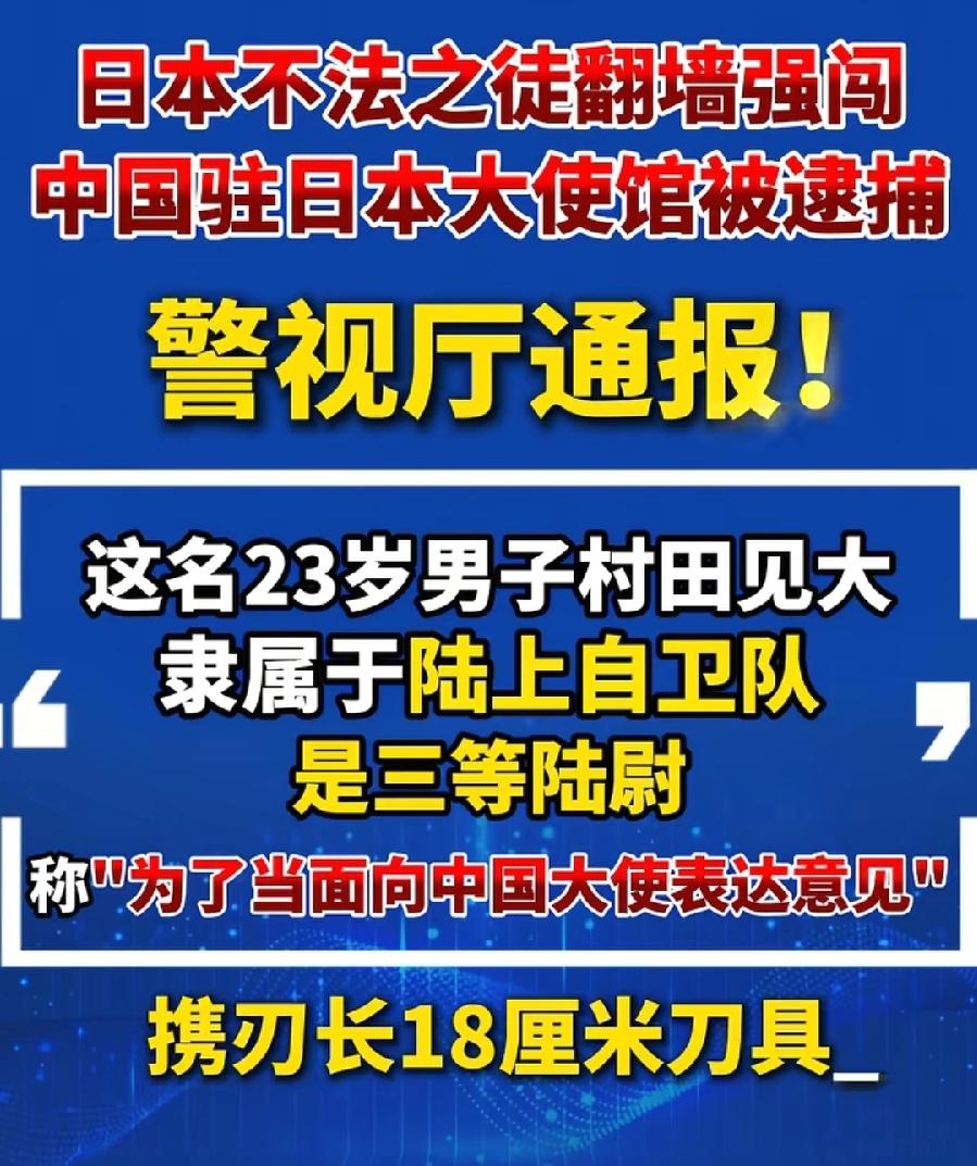 日本闯中国使馆男子,持刀为了自杀,不是行凶?据凤凰卫视驻日记者李淼最新报道,村田见大向警方供述称,进入大使馆想当面提意见,如果不同意就自决!可见真假参半,日本确实有剖腹自杀传统,可是为什么持刀现场自杀?所以也可能为了脱罪说谎,毕竟持刀对别人行凶与自杀,属于完全不同性质! 还有,中国使馆人员应该配枪,或者安保配枪,大使馆视为中国领土,翻墙进入就是越境进入中国领土,可以无条件当场击毙!男子还是现役军官,到底目的什么?看后续调查!