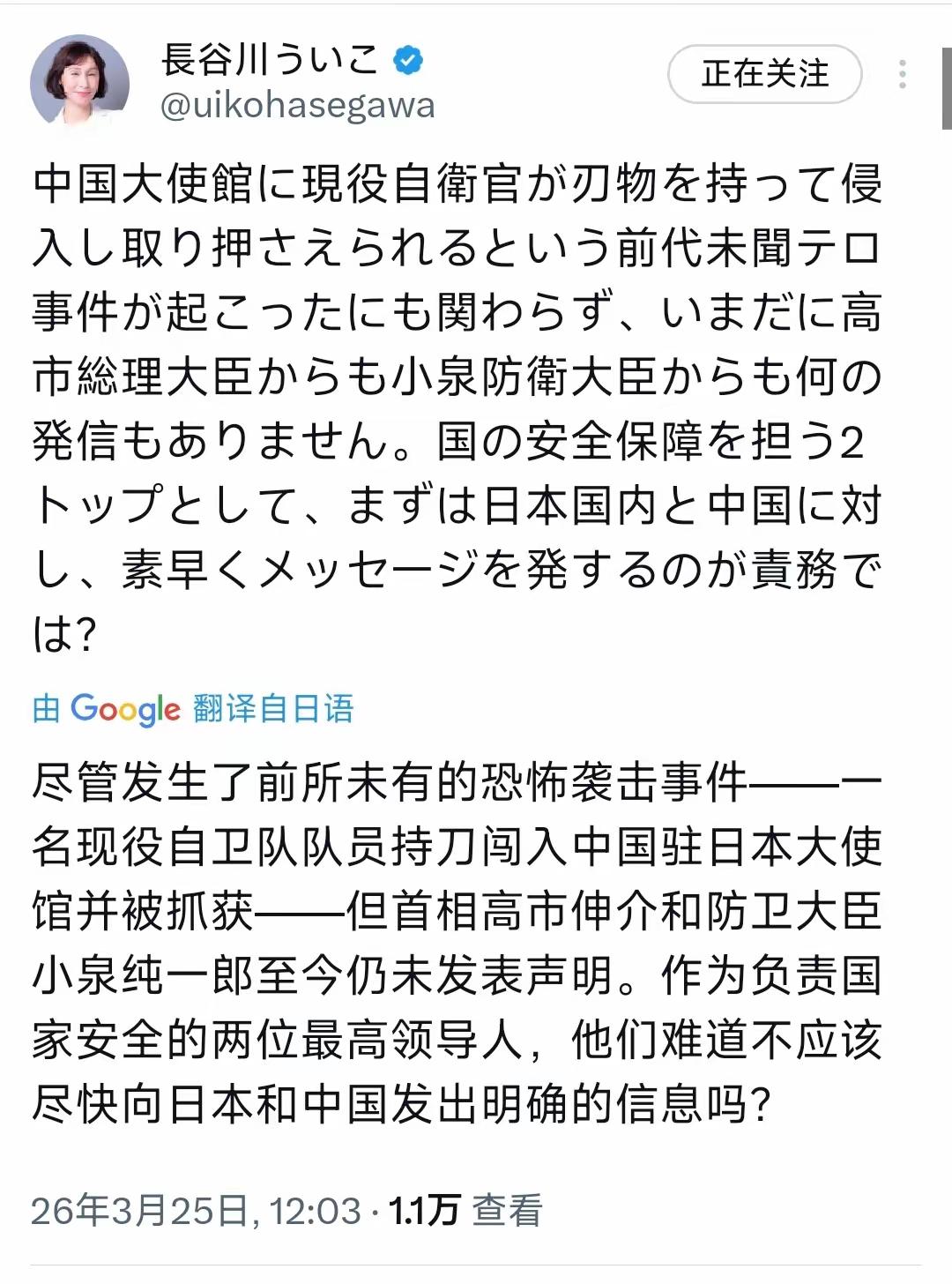 日本首相高市早苗和防卫大臣小泉进次郎至今保持沉默,对日本自卫官闯入中国大使馆未发表任何声明,连日本人都看不下去了。据报道,日本日本政界左翼代表人士长谷川羽衣子称:尽管发生了现役自卫官携带武器闯入中国大使馆并被制服的前所未有的恐怖袭击事件,但迄今为止,高市首相和小泉防卫大臣仍未发表任何声明。作为肩负国家安全保障的两位高层领导人,难道不应当首先向日本国内和中国迅速传达明确的信息吗? 不得不说,日本也有明白人,日本首相高市早苗和小泉进次郎至今不露面,不出面解决问题,保持沉默,其实回避是解决不了问题的,特别是这次如此恶劣的外交事件,现役自卫队成员,带着凶器闯入中国大使馆,不仅事情很大,而且还很恶劣,换作美国大使馆该犯罪分子早就被击毙了。看看高市早苗和小泉进次郎躲过初一,能不能躲过十五?