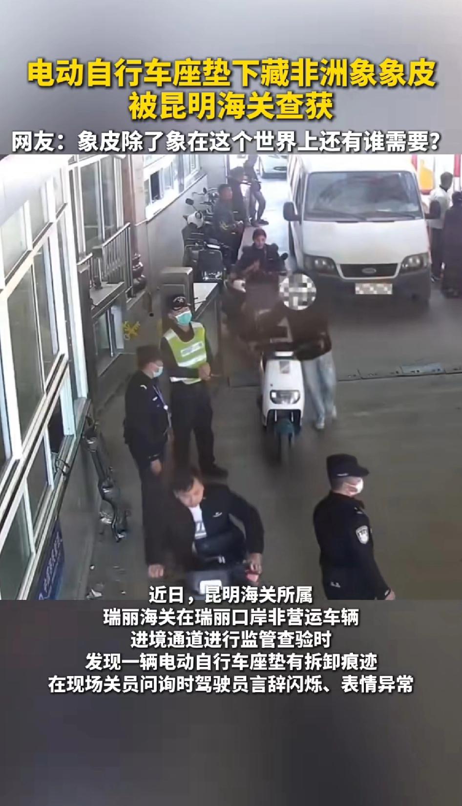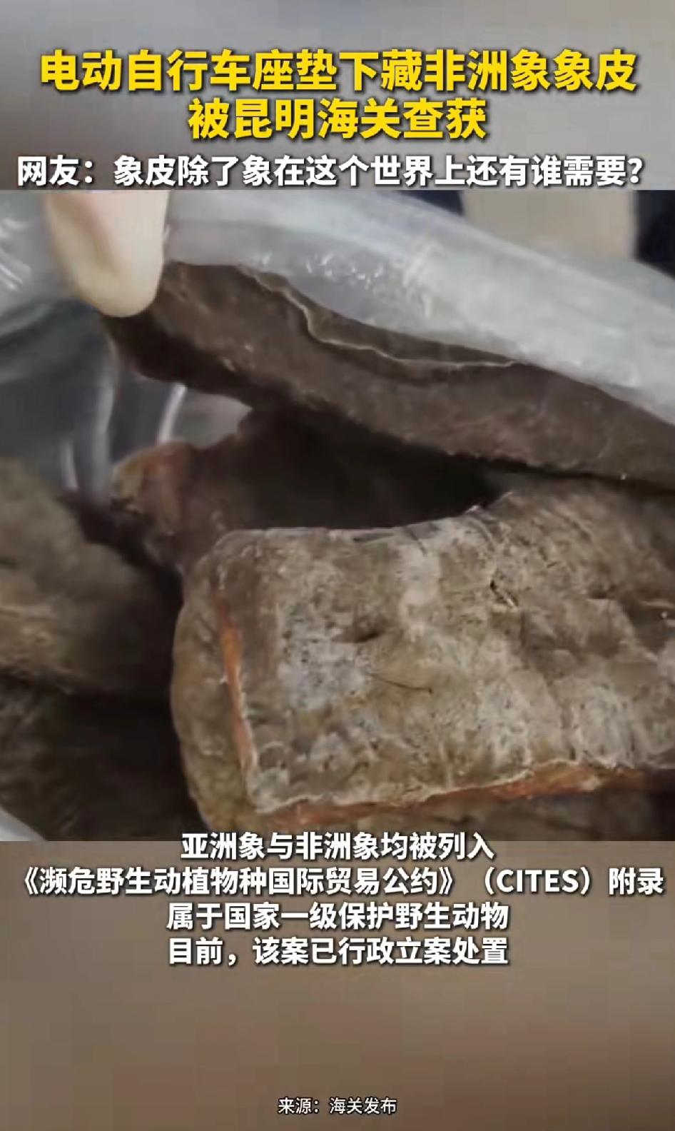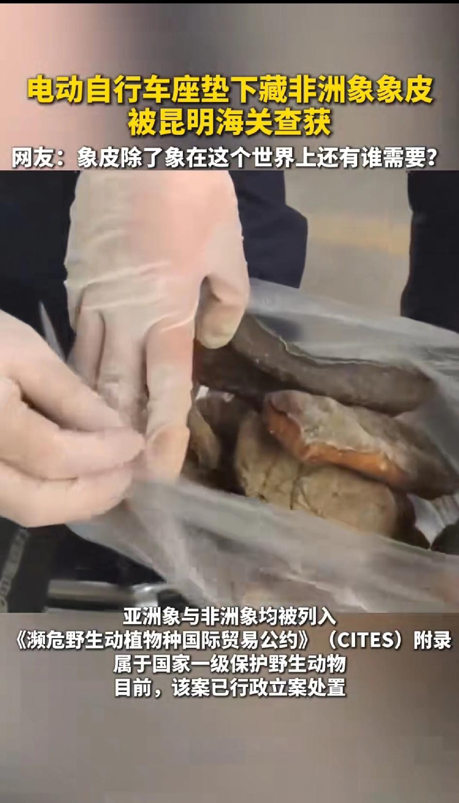 电动车坐底下藏有非洲象象皮,被昆明警方查获! 网友怒了:这个世界除了大象需要象皮,谁还需要象皮?昆明海关查获电动车座垫下藏非洲象象皮,这事儿太让人愤怒了!为了利益,竟把象皮藏在电动车里走私。大象可是国家一级保护动物,被这么捕杀太残忍。 一些不法分子盯上缅甸丰富的野生动物资源,就为了那所谓传统医药价值去走私牟利。可现在象皮、穿山甲鳞片等药用价值都能被其他药品替代,他们还这么干,简直是为了钱不择手段。这次查获意味着至少1只大象、13只左右的穿山甲被捕杀,希望法律严惩这些人,也提醒大家别买濒危野生动植物制品。