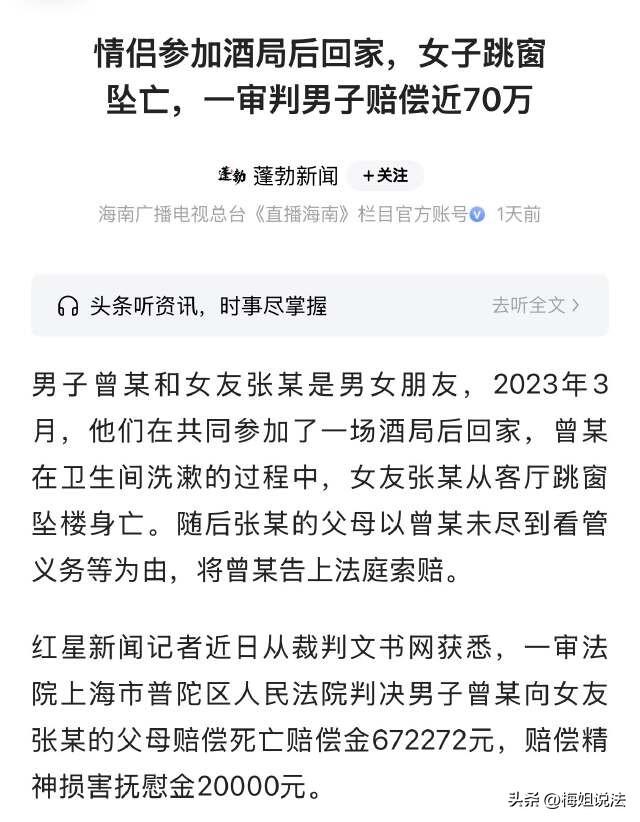 上海,一男子跟女友参加酒局,两个人都喝醉了,男子相对清醒。二人回家之后,男子在卫生间洗漱,女友却突然从客厅的窗户处掉下去了,当时人就失去了呼吸。得知这件事后,女友的父母悲伤不已,认为这件事肯定跟她的男友有关系。 女方父母一纸诉状,将同居的男友给上诉了,要求男子承担全部的责任。最后,相关部门的判定也下来了,确实这件事,男子也有责任。 蓬勃新闻3月24日报道了这则新闻。 据悉,曾先生跟张女士是男女朋友关系。 接到朋友邀请,曾先生跟张女士一同参加了一场酒局,期间,两个人都喝了不少酒,喝完酒之后,二人都是醉醺醺的。 酒局结束后,二人回到了住处。 根据楼栋电梯里的监控显示可知,张女士醉酒比较严重,几乎是无法站立,完全就要依靠男友搀扶前行。 回到家之后,曾先生把女友搀扶到床上休息,自己就在客厅里缓缓酒、醒醒神,毕竟自己也喝的不少。 没过多久之后,张女士从卧室里走出来,反复催促男友去洗漱。因为催的比较着急,曾先生则很不耐烦的说:“烦死了,催什么催。” 两个人就僵持了一会儿,之后曾先生就独自走进了洗手间里,准备刷牙洗脸。这个时候,女友则独自一个人留在了洗手间。 前后也就短短几分钟的时间,客厅外面突然传来“哗啦”一声巨响。 曾先生感觉不大对劲,立刻就跑出来查看情况。客厅里已经不见了女友张女士的身影,而窗台部位有异常,曾先生跑过去一看,发现女友已经掉下去了。 等到曾先生跑到楼下查看的时候,女友已经没了呼吸,当场就离世了。 随后,曾先生立刻就拨打了救助电话,并且及时报了警。 家属得知这件事之后,悲痛欲绝。去做检测发现,张女士体内酒精浓度严重超标,属于严重醉酒的情况。 办案人员给曾先生作笔录,发现张女士酒后,出现过想要掉下去的过激行为。曾先生作为男友应该要多加留意,但是当时他却没有放在心上。 事发后张女士父母将曾先生给上诉了,要求他赔偿经济损失。 张女士父母认为,女儿跟男友同居了2年,应该知道女友的性格、性情。重度醉酒,失去自理能力,作为屋内唯一陪伴者,曾先生负有对女儿看管、照顾和救助的义务。 由于曾先生的疏忽,导致这个悲剧的发生,他需要承担责任。 曾先生也大声喊冤,感觉自己也很委屈,因为当时他自己也喝了不少酒,也安顿了女友,之后突然掉下去,这个就很异常,不是他可以预见的情况,更加不能阻止。 相关部门是怎么判定的呢? 经过一番审理,工作人员可以确定以下的事实。 第一、张女士当时严重醉酒,基本丧失对于自身行为的判断和控制能力。 第二、曾先生虽然饮酒,但是意识比较清醒,需要对同饮者张女士的人身安全负有一定的照顾和保障义务。 第三、曾先生做的笔录可知,他明知道张女士有酒后过激行为,但是仍然表现出不耐烦的情绪,可能会刺激到张女士。 第四、张女士作为成年人,是完全行为能力人,需要对自己的行为承担主要责任。 最后,审判的结果下来了,张女士本人承担60%的责任,曾先生承担40%的责任,赔偿家属70万元。 根据《民典法》规定,同饮者存在同居关系,且一方重度醉酒,另一方要恪尽照护义务,如果没有尽到保护责任,其行为存在过错,需要承担部分赔偿责任。 同居关系,会让男女双方形成事实上的生活以来,照护义务依法产生。 尤其是当对方丧失了部分行为能力时,如醉酒、生病,法律有所规定,其中一方对于另一方的生明安全负有临时性的保护责任。 因此,本案中的曾某,作为同饮者、以及房屋内的唯一同住人,需要对醉酒女友负有法定的照护义务,将其独自留在客厅,之后也没有察觉异常,则需要承担部分的赔偿责任。 总之,这件事又是因为喝醉酒引发的。酒局之后,有“四个必须”务必要清楚。 1.必须劝阻对方不要过度饮酒,尤其是当对方已经身体不适; 2.必须要安全护送,确保对方安全抵达住所; 3.必须要妥善安置对方,远离危险区域; 4.必须要有人看护,至少陪伴者需要意识清醒。 了解法律知识的同时,不仅是规避法律风险,更加是要尊重生命。 对于此案,你怎么看呢?