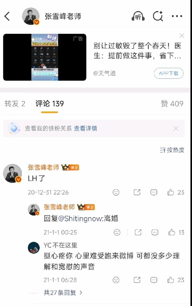 其实张雪峰老师早在6年前就已经离婚了,他的员工都知道。当时他在微博上有透露,只不过当时他的关注度没有现在这么高。大家不知道而已。翻开他之前的微博,信息还在。 时间是2020年。 去年和他一起看伍佰演唱会的是他后来的妻子或者女朋友。 他是离婚后从北京来到了苏州。2021年在苏州开公司,事业崛起。短短几年的时间,今年,他事业上升期刚满第5年。最辉煌的时候,他离开了。