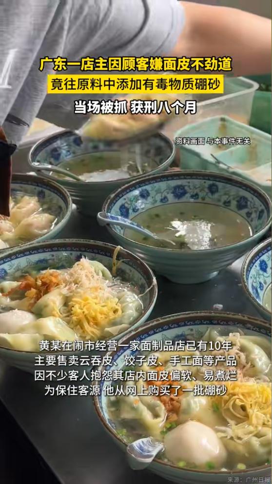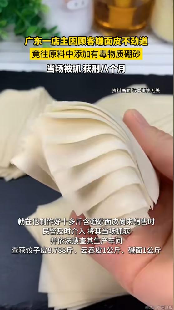 还好发现的及时!广东,一男子开店卖面制品,前段时间,老有人嫌他家的面皮不筋道,嚼着没劲,生意一天比一天淡,男子竟在朋友的建议下,在面皮制作中加入硼砂,好在民警及时介入,这才避免了面食流入市场。网友:必须严惩! 顾客提意见,按理说是好事,说明还有人愿意给你机会。你要么换面粉,要么改工艺,想办法把口感提上去,这才是正路。但黄某没这么干 一个老朋友给他出了个主意,说加点硼砂进去,面皮立马筋道,口感蹭蹭上来了。黄某一听,动了心 最让人无奈的是,他不是不知道这东西有毒,也不是被人骗了,他是明明知道,还是决定往里加。他想着,少加一点,顾客吃不出来,生意稳住了就行 他从网上买了硼砂,按分量掺进面团里,自己心里还盘算着,应该没事。但他没想到的是,他那一批加了硼砂的面制品,还没来得及卖出去,民警就找上门了。一丁点都没流向街坊的餐桌,全被查扣了 说实话,这个事最让人气愤的,就是黄某明知道自己这个行为的性质,却还是坚持 硼砂这东西,早就被国家明令禁止用在食品里,吃多了对肝肾损伤很大,尤其是老人小孩,代谢能力差,长期吃后果不堪设想。可偏偏总有人抱着侥幸心理,觉得自己下手轻,别人吃不出来,也不会出事 街坊邻居愿意花钱买你的东西,买的是放心,图的是信任。你为了口感好一点,就往里加不该加的东西,这不是在救生意,这是在砸饭碗 好在这回民警动作快,东西没流出去,他也被及时摁住了。不然真等哪家老人、哪个孩子吃出了问题,那就不是生意保不保得住的事了,那是要担责的