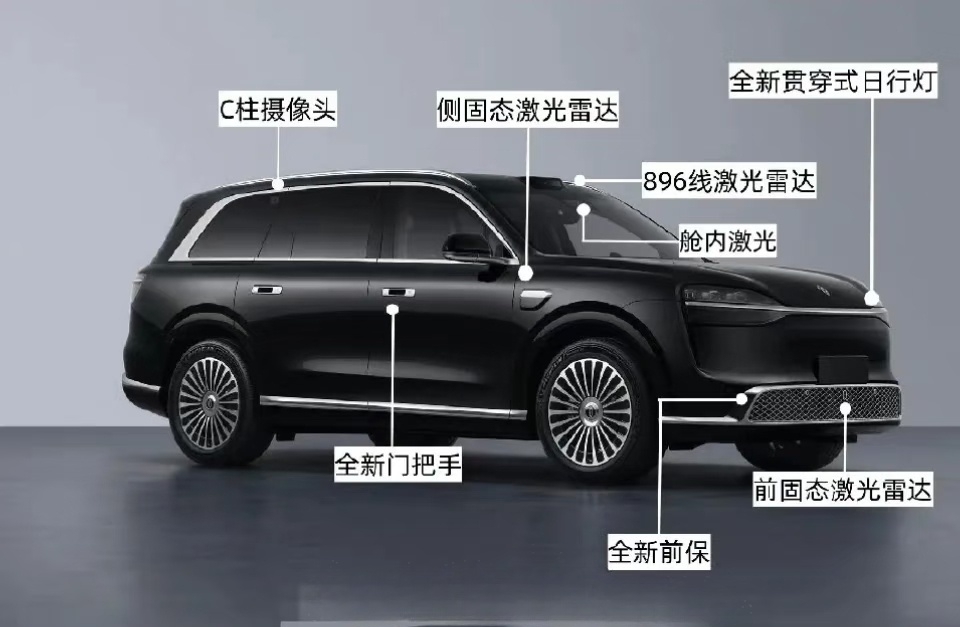 26 款 M9 做了整体升级,感觉叫 M9L 更合适,车身尺寸从 5.23 米做到 5.28 米,增程版电池由原来 42 度和 52 度加大到 60 度和 75 度,更换尊界 S800 同款门把手(手可摘星辰),新上大饼轮毂,新增 896 线激光雷达。