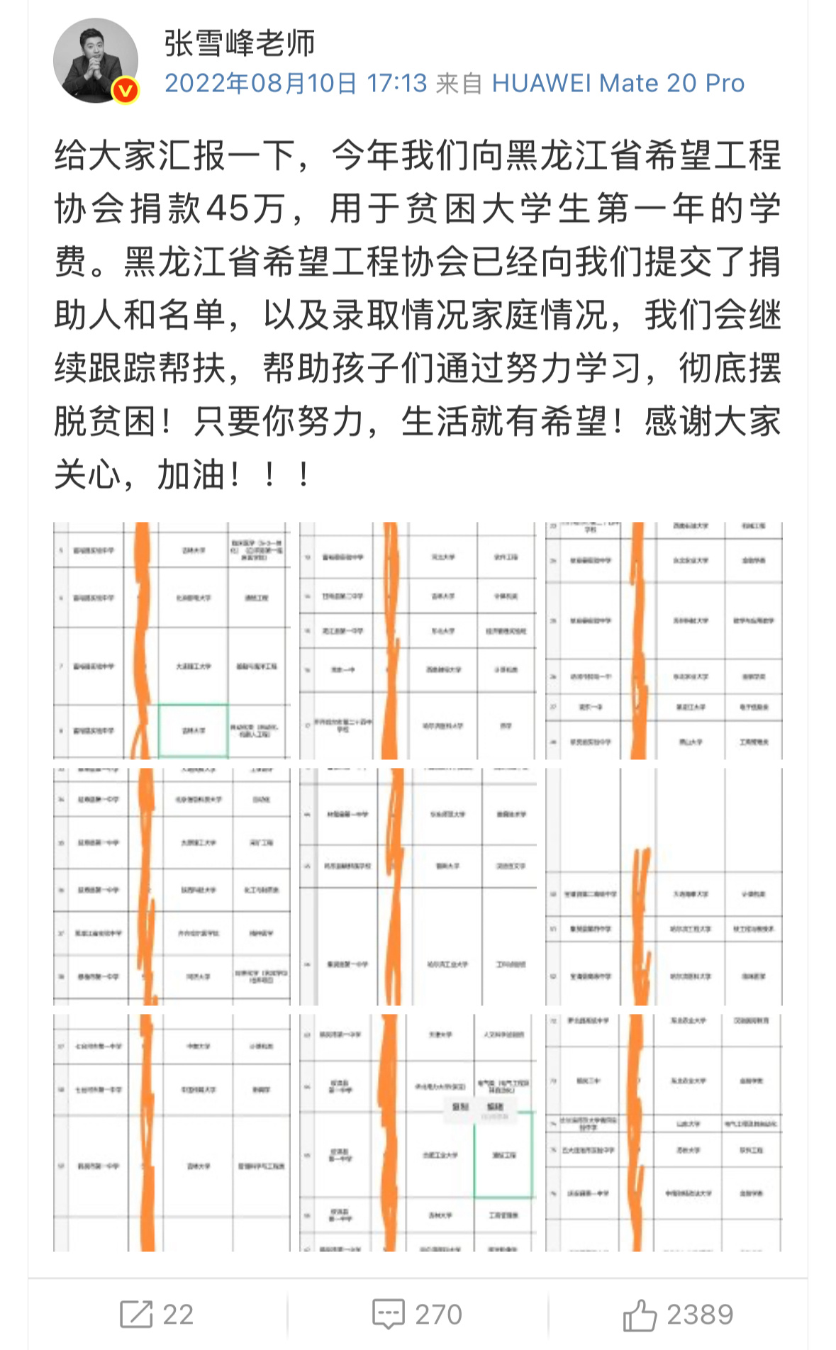 在以升学规划为大众熟知的张雪峰身后,微博这座虚拟广场,并未留下喧嚣的浮华,反而沉淀出一份跨越三省七地、累计超1200万元的公益版图,以及2200个寒门学子重燃的未来。张雪峰微博里的捐款回执张雪峰帮助2200名贫困学子