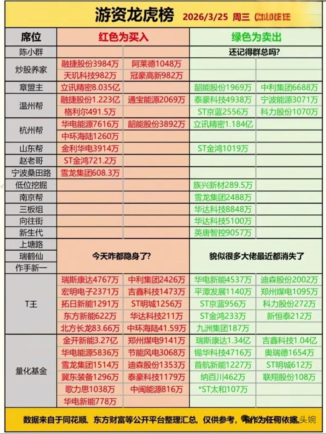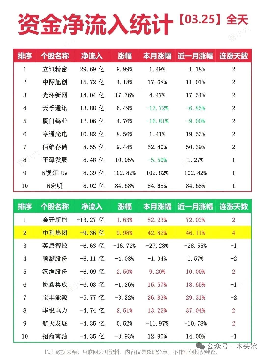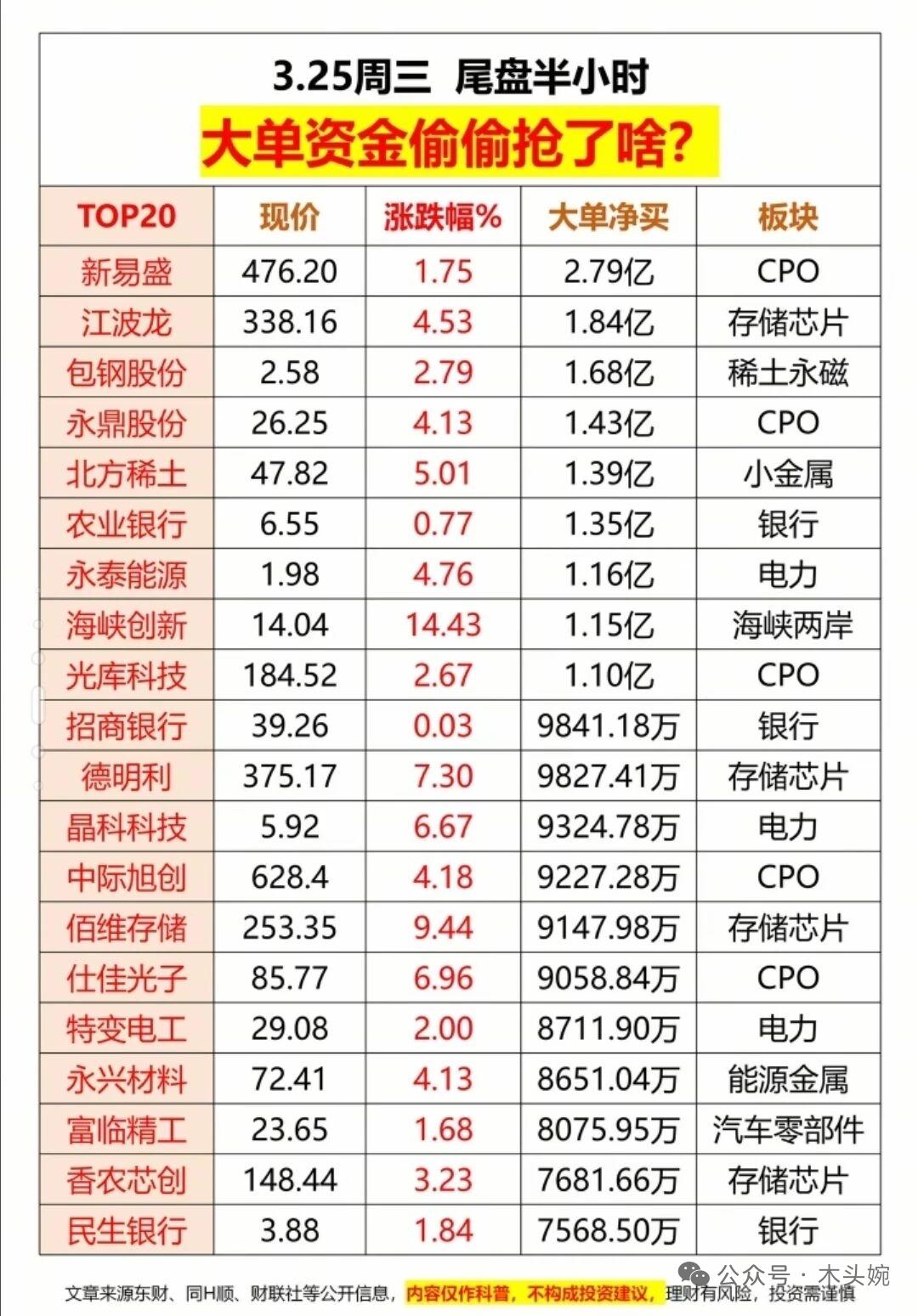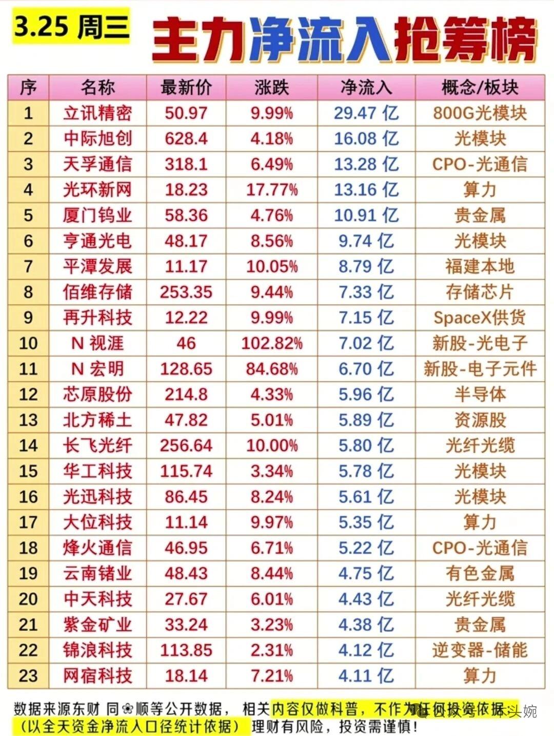 3.25周三市场复盘:算力+光模块火力全开,电力主线持续强势! 主力净流入TOP20被光模块、算力、贵金属霸榜,立讯精密、中际旭创、光环新网稳居前列,游资也在积极加仓融捷股份、阿莱德等热门标的。 ​ 尾盘半小时大单资金重点偷袭CPO、存储芯片、电力板块,新易盛、江波龙、北方稀土等获超亿级资金抢筹。 整体来看,市场主线聚焦电力+科技算力,量能持续放大下,短线情绪与趋势行情共振,不过高位股分化加剧,操作上仍需聚焦核心主线,谨慎追高。 ⚠️ 风险提示:以上内容仅为市场复盘分享,不构成任何投资建议,理财有风险,投资需谨慎。