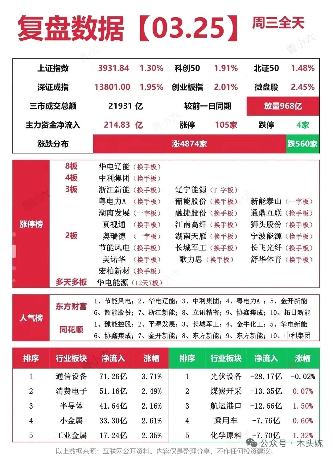 3.25周三市场复盘:算力+光模块火力全开,电力主线持续强势! 主力净流入TO