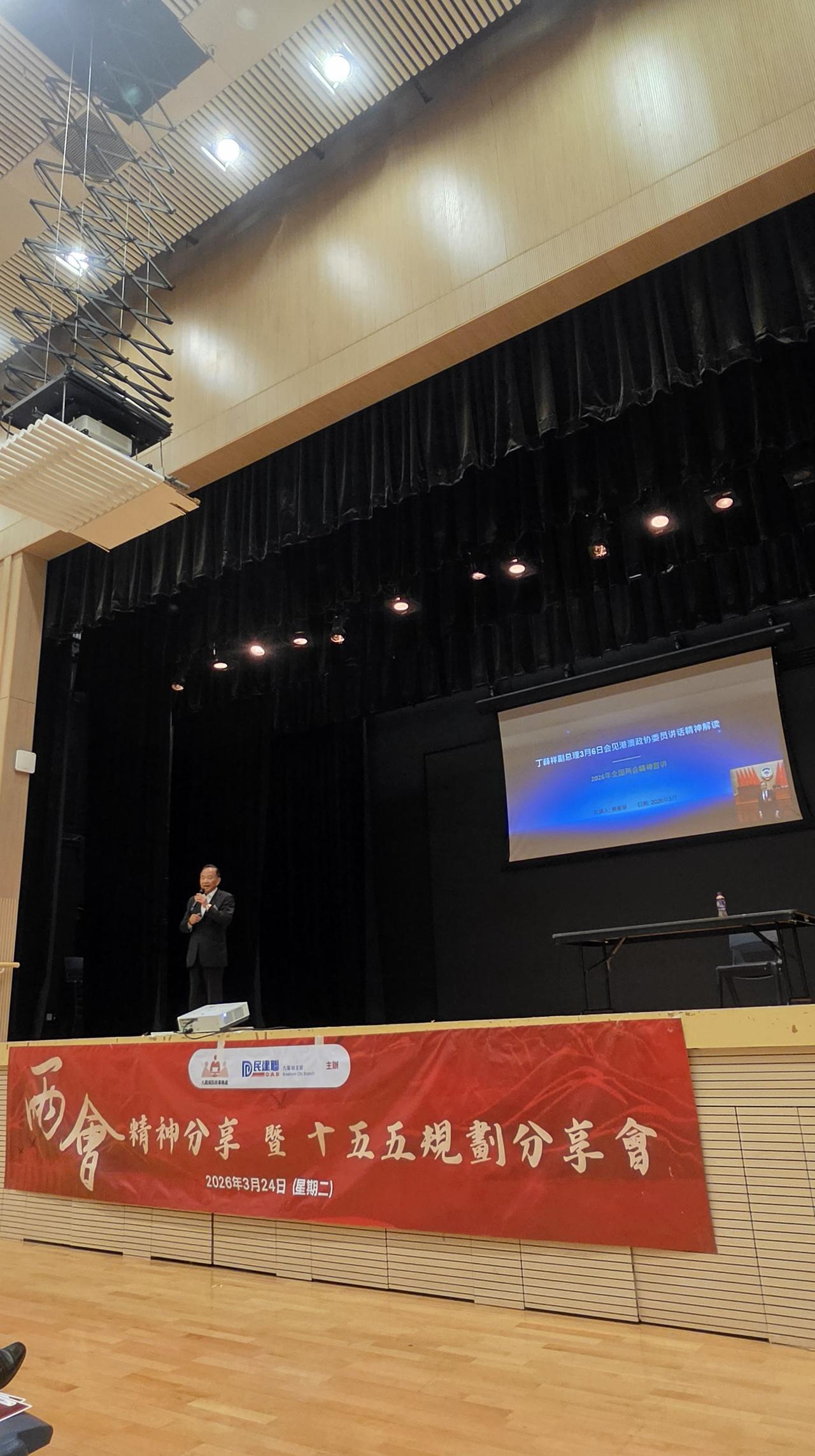两会精神分享会暨十五五规划分享会 为深入学习及贯彻全国「两会」精神,加强社区对国家发展方针的理解,九龙城民政事务处及民建联九龙城支部再次联合主办「两会精神分享暨十五五规划分享会」。 本次分享会由九龙城民政事务专员蒋志豪致词,亦邀请到全国人大常委、立法会主席李慧琼女士, GBS JP,以及港区全国政协委员樊敏华担任主讲嘉宾,剖析两会政策要点,并聚焦国家“十五五” 规划的发展方向及其对香港社会的启示。 高Sir至今已出席多场分享会,每次也长知识,有所领悟。
