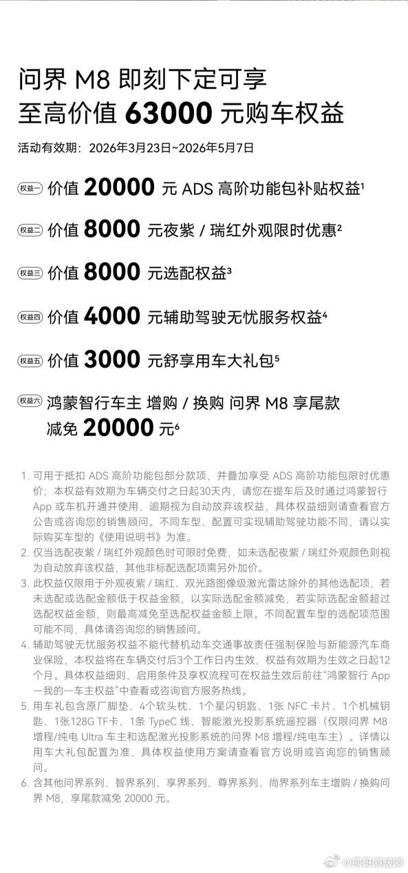 除全新车色外,问界M8新增的松鼠与松果迎宾灯效,以灵动可爱的松鼠与饱满松果为光影意象,点亮专属迎宾仪式,在每一次出行与归家时刻,带来治愈、温暖与吉祥相伴的仪式感。此外,升级后的问界M8还配备21英寸曜影运动轮毂,进一步强化整车运动姿态与高端豪华气场,提升车型外观辨识度与高端质感。发布会上,问界M8 Max增程长续航版重磅发布,在延续超强智能感知能力的基础上,实现续航性能全面跃升。新车配备53.4kWh电池,CLTC纯电续航里程可达322km,综合续航里程高达1590km,城市通勤与长途远行皆可从容应对。同时,车辆搭载途灵平台,兼顾操控灵活性与乘坐舒适性,让老人、儿童乘坐更舒心惬意,全方位提升家庭出行品质。为让用户轻松拥享智慧豪华体验,问界M8推出多重权益,即日起至2026年5月7日下定,即可享受至高价值63000元购车权益,包括价值20000元ADS高阶功能包补贴权益、价值8000元夜紫/瑞红外观限时优惠、价值8000元选配权益、价值4000元辅助驾驶无忧服务权益,以及价值3000元舒享用车大礼包,同时鸿蒙智行车主增购或换购问界M8享尾款减免20000元,多重礼遇一步到位。