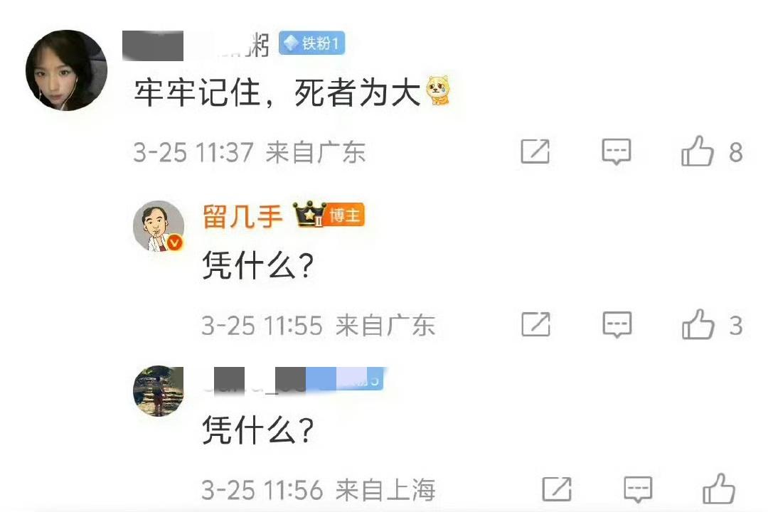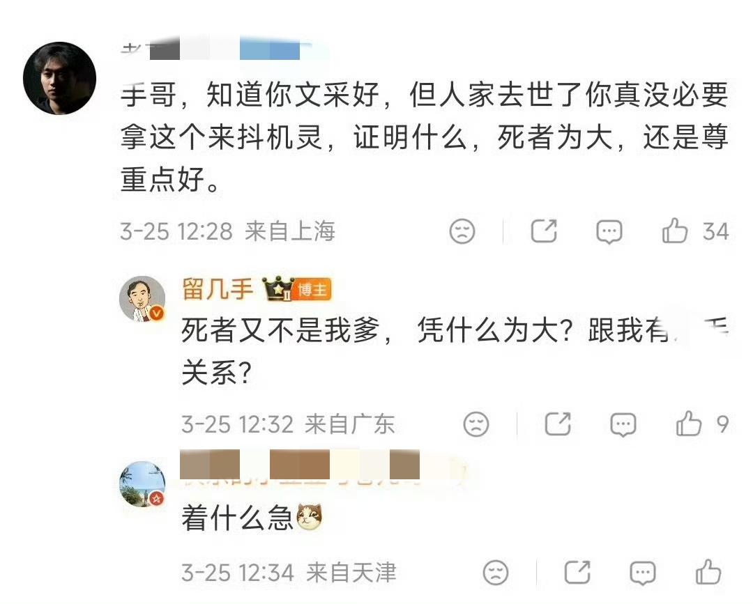 张雪峰老师猝然离世,普通网友都在惋惜和感叹。留几手的一条微博却让人膈应 ! 一句“东北网红数量减一”,把一条鲜活的生命轻描淡写成数字游戏, 连他的铁粉都看不下去,规劝他“死者为大”,结果他回怼粉丝 “死者又不是我爹,凭什么为大”?。 同为网红,还都是东北老乡,就算不深切缅怀,起码做到尊重逝者吧。 张雪峰深耕教育多年,实实在在帮助了很多普通家庭的孩子,这份社会价值有目共睹,起码比留几手的社会价值高多了。 留几手一边标榜不逐名利,一边又在逝者身上蹭热度。 真的让人💢💢了!