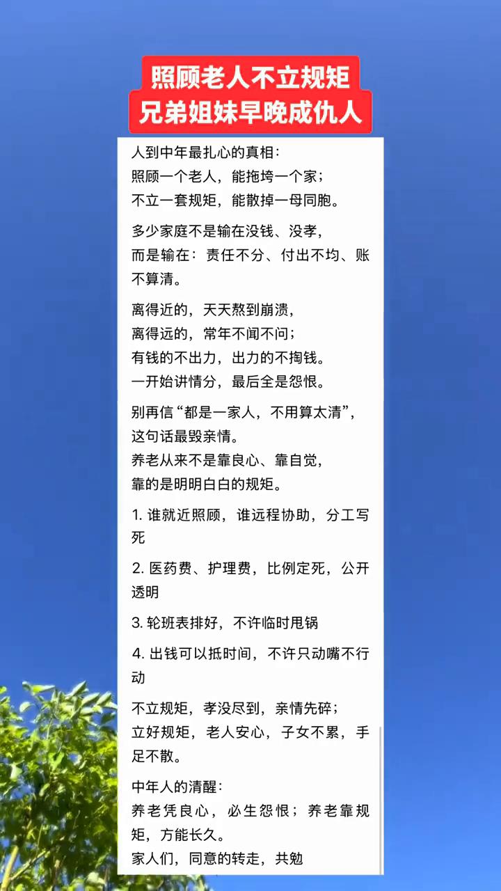 照顾老人不立规矩,兄弟姐妹早晚成仇人。 人到中年最扎心的真相:照顾一个老人能拖垮一个家;不立一套规矩能散掉一母同胞。多少家庭不是输在没钱、没孝,而是输在责任不分、付出不均、账不算清。离得近的天天熬到崩溃,离得远的常年不闻不问;有钱的不出力,出力的不掏钱。一开始讲情分,最后全是怨恨。别再信"都是一家人,不用算太清"。这句话最毁亲情。 养老从来不是靠良心、靠自觉,靠的是明明白白的规矩。 ·1.谁就近照顾,谁远程协助,分工写死。 ·2.医药费、护理费比例定死,公开透明。 ·3.轮班表排好,不许临时甩锅。 ·4.出钱可以抵时间,不许只动嘴不行动。 不立规矩,孝没尽到,亲情先碎;立好规矩,老人安心,子女不累,手足不散。中年人的清醒:养老凭良心,必生怨恨;养老靠规矩,方能长久。家人们,同意的转走,共勉。