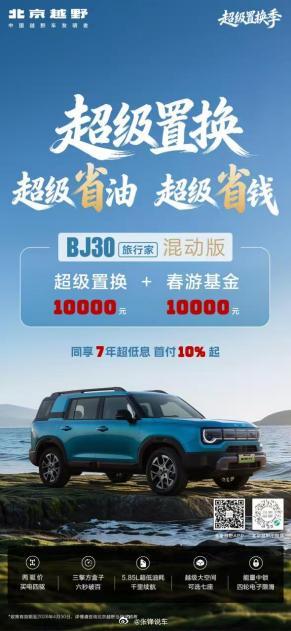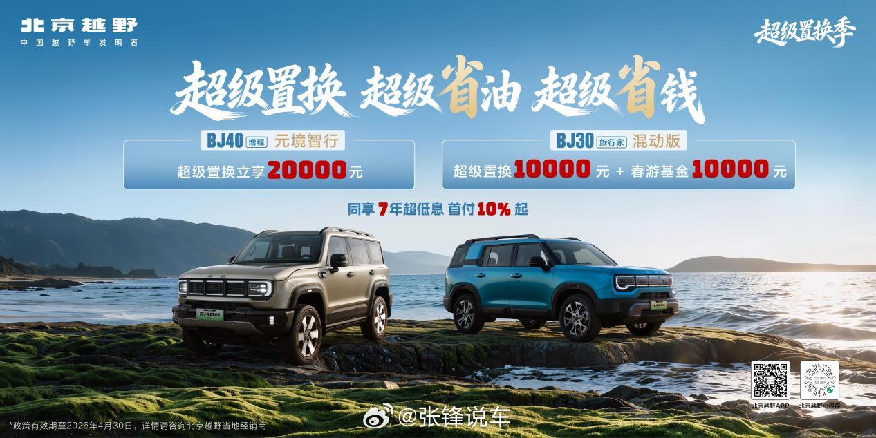 北京越野开启超级置换季,“超级置换补贴+春游基金”优惠享不停!近日,为了回馈广大消费者,北京越野开启超级置换季活动。该活动分为两部分,第一部分以“超级置换+超级省油+超级省钱”的组合拳,针对BJ30旅行家混动版、BJ40增程元境智行两款车型,推出了极具竞争力的置换政策;第二部分则为BJ40增程赤兔版和BJ40探险家推出了专属优惠福利,让更多新老车主感受到了品牌的十足诚意。此次活动时间3月24日至4月30日。