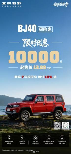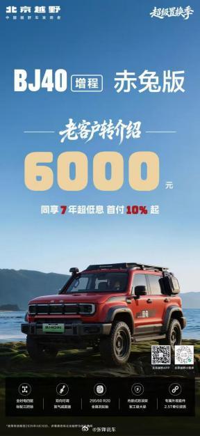 此外,北京越野还为BJ40增程赤兔版和BJ40探险家推出了专属优惠福利。北京越野老车主推荐购买BJ40增程赤兔版,可获得6000元奖励,这不仅是对老车主忠诚度的回馈,更将“省钱”的机会从购车者延伸到了推荐者身上;BJ40探险家限时优惠10000元,起售价13.99万元。直降优惠让这款车型以更具竞争力的价格进入更多消费者的视野,省了多少一目了然。通过以上多维度优惠政策,北京越野构建了一个覆盖首购、换购、推荐、分期等全场景的“省钱体系”。无论是新用户还是老车主,都能找到适合自己的省钱方式,让不同需求的消费者,都能以最划算的方式,开上心仪的车。