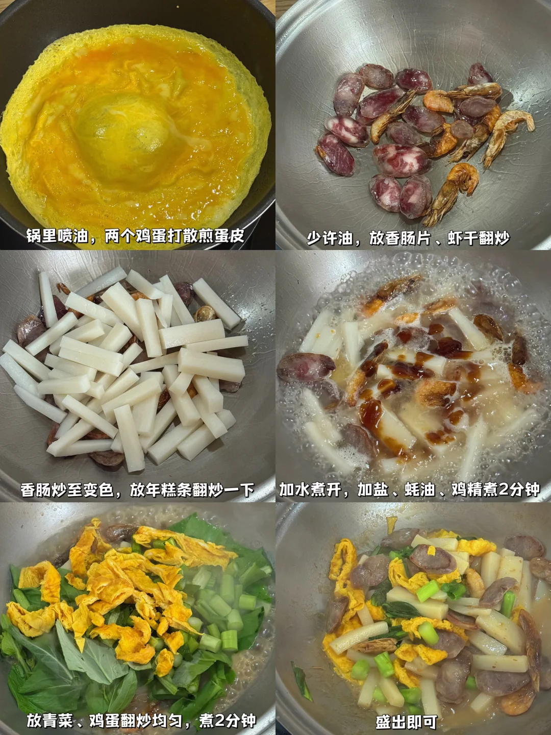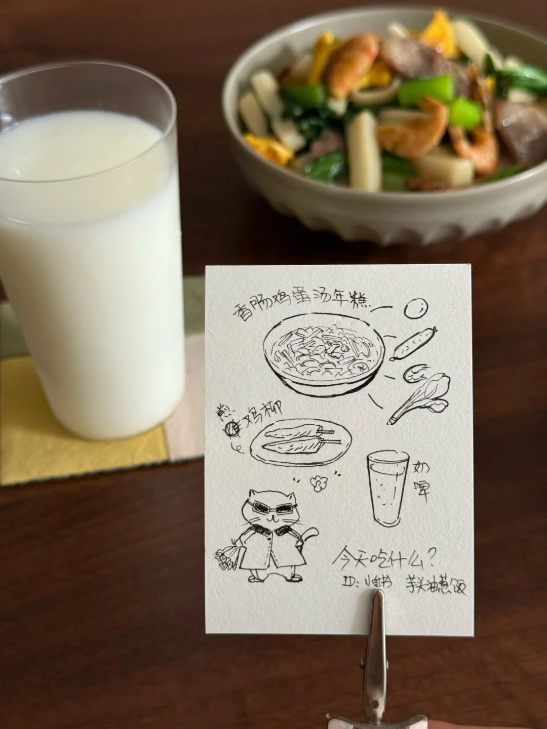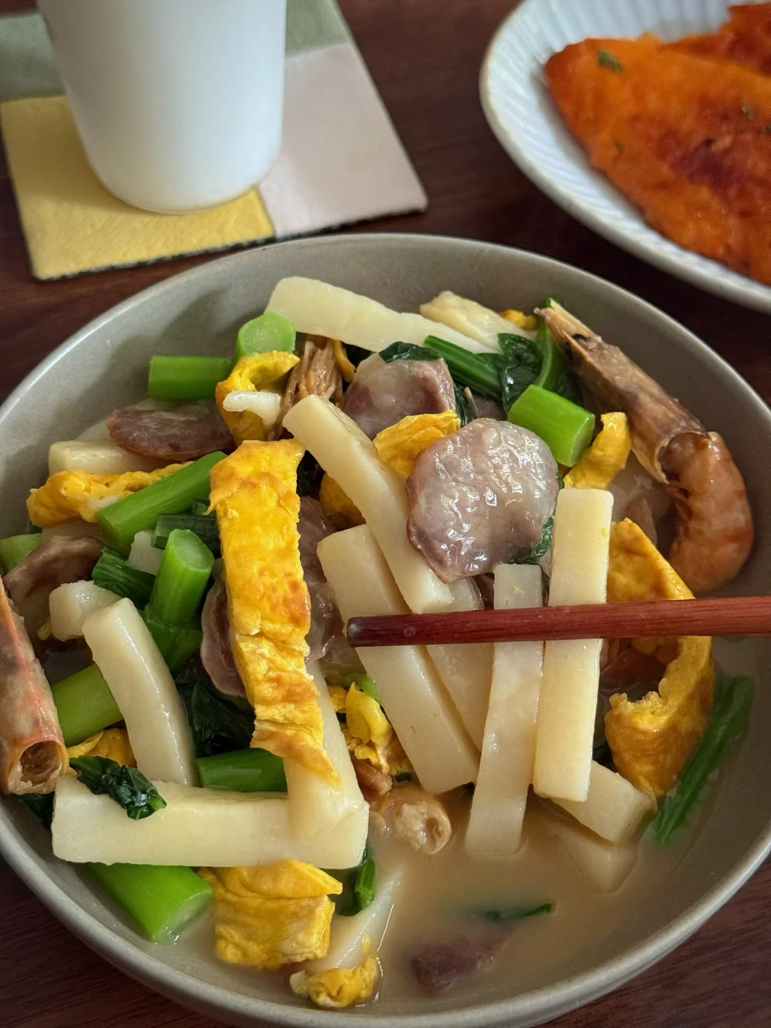 今日分享:香肠鸡蛋汤年糕、煎鸡柳、奶啤 😗谁懂啊!浙江人的冰箱里或水缸里,年糕永远囤到吃不完~ 🍥年糕可能就是昨天中午、今天中午、明天中午的饭••• 今天用灌的香肠、晒的虾干,煮了一锅料多多香肠鸡蛋汤年糕。 年糕的Q弹,香肠的咸香、虾干的鲜、青菜的脆嫩,再加上金黄的鸡蛋,很丰富! 搭了简单的煎鸡柳,开一罐清爽奶啤🍻 这才是好好吃饭的仪式感!