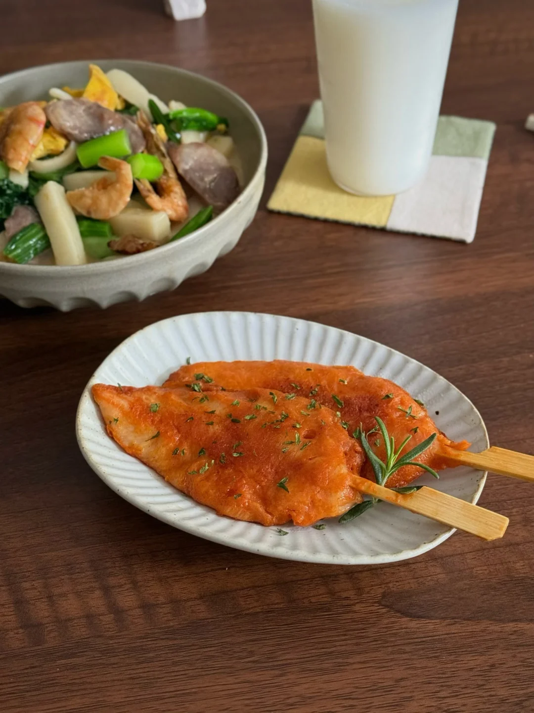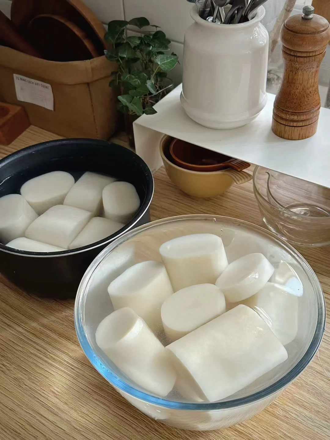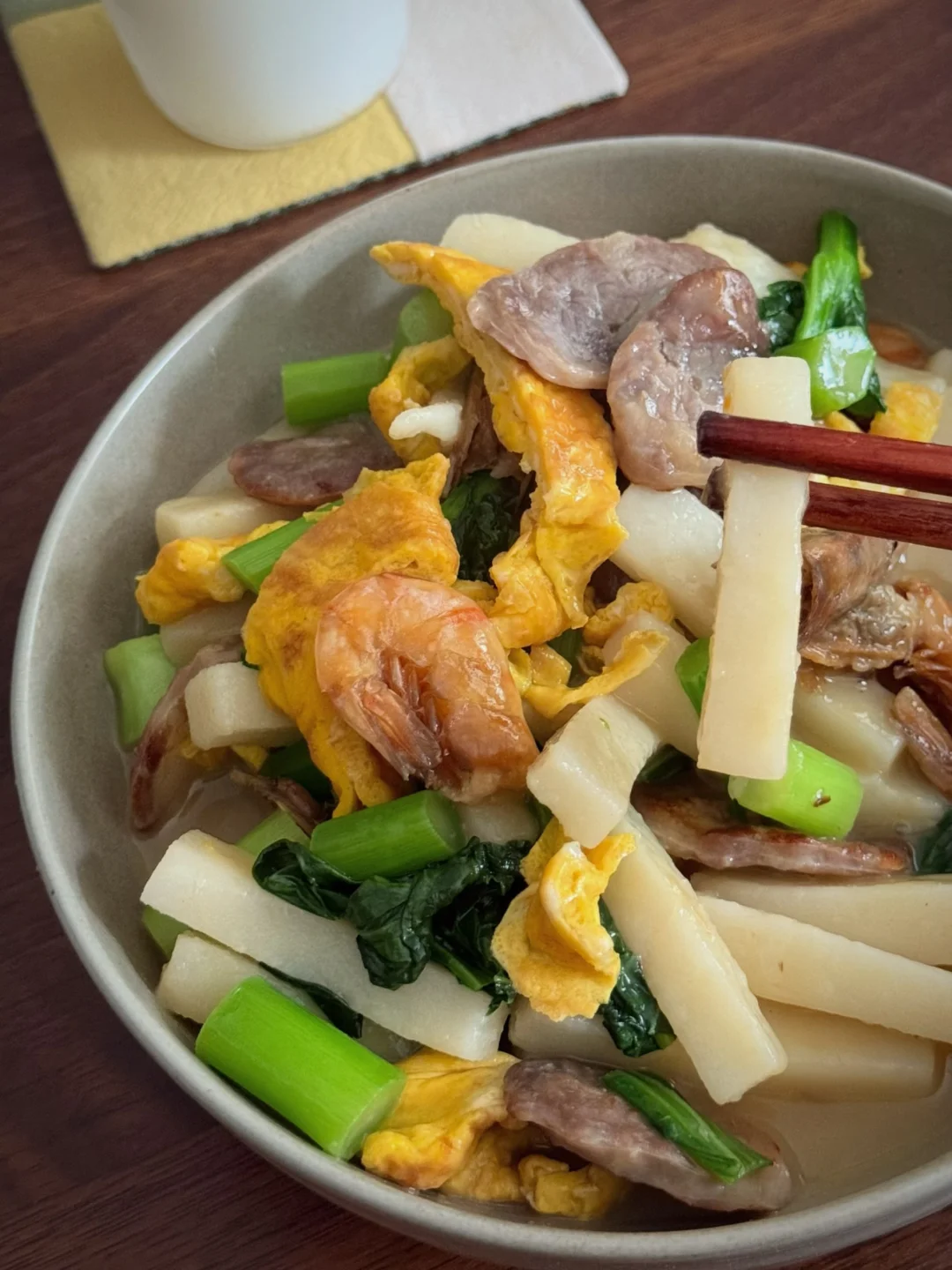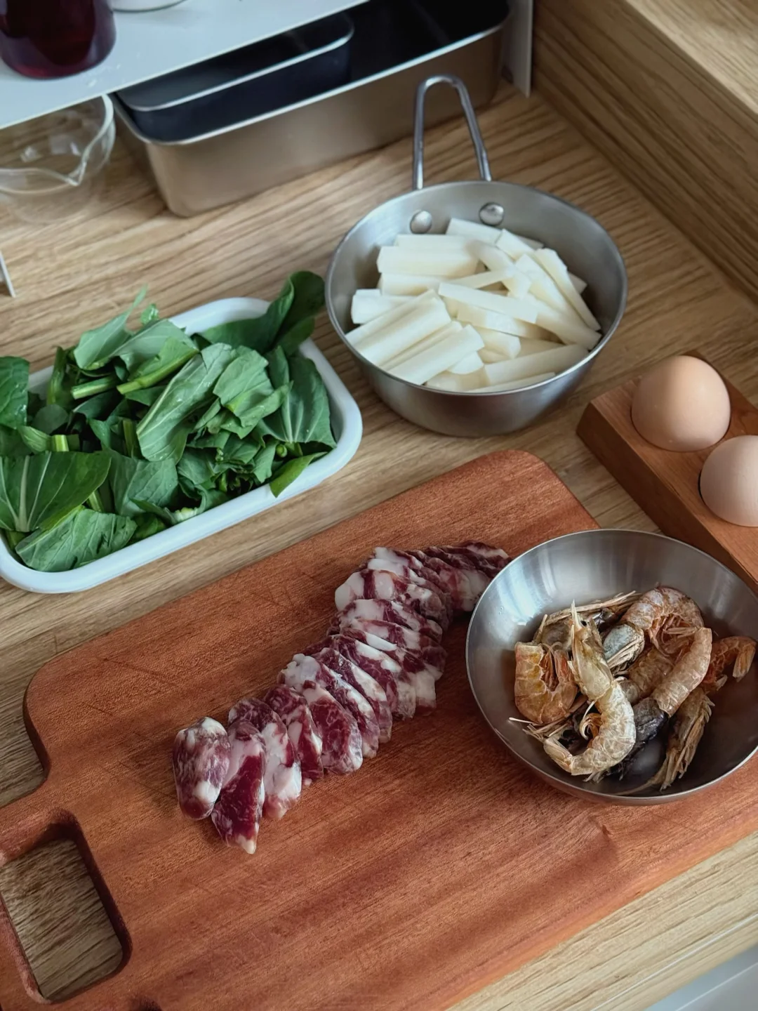 今日分享:香肠鸡蛋汤年糕、煎鸡柳、奶啤 😗谁懂啊!浙江人的冰箱里或水缸里,年糕永远囤到吃不完~ 🍥年糕可能就是昨天中午、今天中午、明天中午的饭••• 今天用灌的香肠、晒的虾干,煮了一锅料多多香肠鸡蛋汤年糕。 年糕的Q弹,香肠的咸香、虾干的鲜、青菜的脆嫩,再加上金黄的鸡蛋,很丰富! 搭了简单的煎鸡柳,开一罐清爽奶啤🍻 这才是好好吃饭的仪式感!