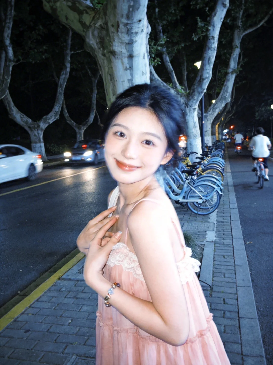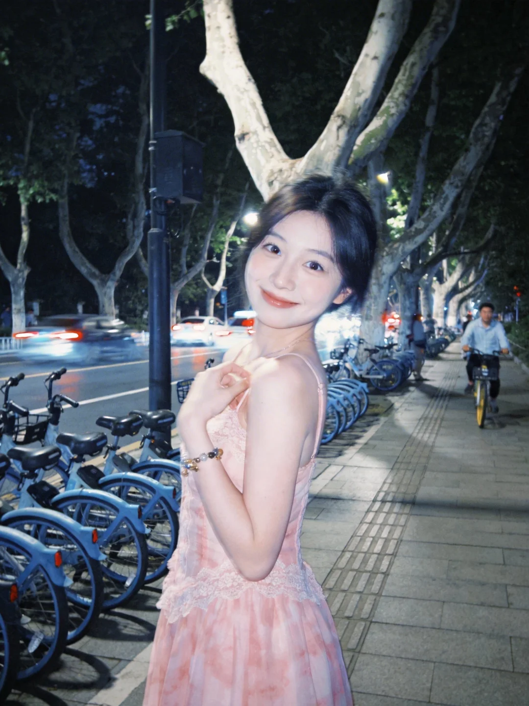 日常抓拍,非对称构图,斜拍,扭头,侧身,开心,高噪点,低画质,边缘柔焦,面部失焦,动态模糊,背景弱环境暖光,面部冷光补光(微微过曝),低饱和度,冷色调统一色调,18岁网红,漂亮女生,少女,幼态脸,小鹿圆眼,眼睑下至,粉色蕾丝花边雪纺质感吊带裙,首饰,手链。夜晚的街道,人行道路上的梧桐树,整齐排列摆在树与树之间的公共自行车,道路上车来车往,骑自行车的人,她站在人行道上,对着镜头微笑,做可爱姿势