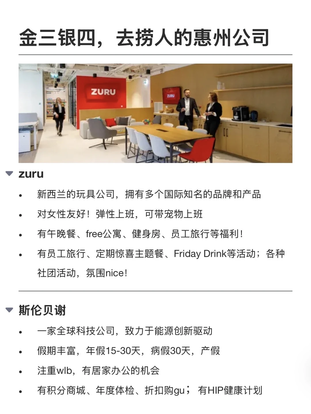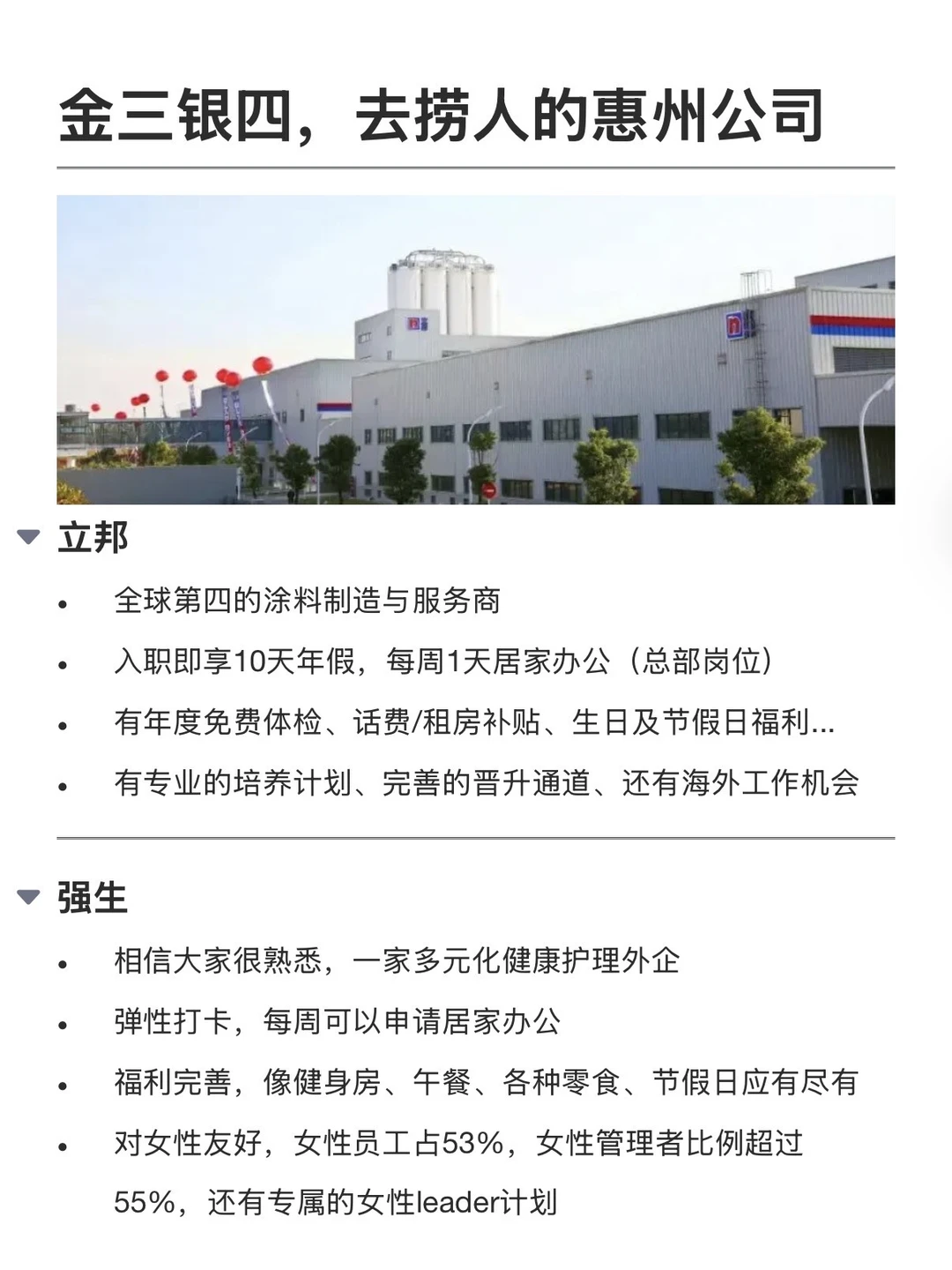 惠州发展真的越来越好,有不少小而美、冷门宝藏的公司,金三银四是真的很多的机会! 特别是有不少小众冷门的外企,真心建议大家可以去试试 · 大家不要觉得外企很难进 其实外企也有一些常规类、英语要求没有那么高的岗位 · 为什么还是值得去外企? ▪️氛围好,对女性友好,年假长,平均年假都是15天 ▪️还支持居家办公、福利完善,是真的能实现WLB ▪️待遇也还不错,这段时间找工作的真的可以考虑考虑~ · 坚持日更,帮大家在找工作路上顺利拿 offer! ·