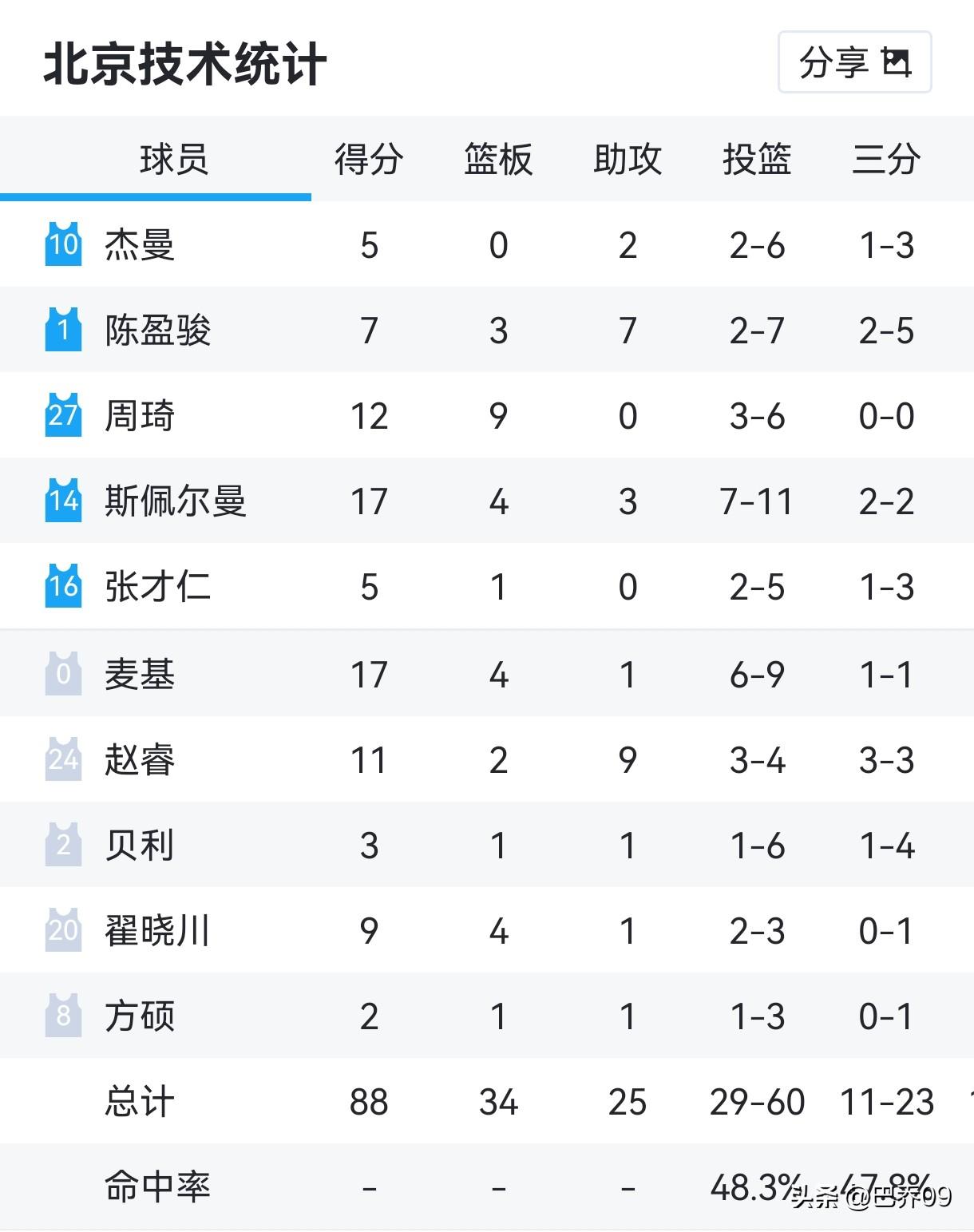 北汽88-75浙江 末节一波流制胜|从数据看你认为谁是取胜关键 1. 斯佩尔曼:17分4板3助2断|投篮11中7(63.6%)|二分9中5(55.6%)|三分2中2(100%)|正负值+18 2. 周琦:12分9板2帽|投篮6中3(50%)|二分6中3(50%)|三分0中0|罚球7中6(85.7%)|正负值+15 3. 陈盈骏:7分3板7助|投篮6中2(33.3%)|二分4中0|三分2中2(100%)|正负值+8 4. 杰曼:5分2助|投篮6中2(33.3%)|二分4中1(25%)|三分2中1(50%)|正负值+5 5. 张才仁:5分1板|投篮5中2(40%)|二分3中0|三分2中2(100%)|正负值+12 6. 麦基:17分4板1助1帽|投篮9中6(66.7%)|二分8中5(62.5%)|三分1中1(100%)|正负值+20 7. 赵睿:11分2板9助|投篮5中3(60%)|二分2中0|三分3中3(100%)|正负值+21 8. 翟晓川:9分4板1助|投篮3中2(66.7%)|二分3中2(66.7%)|三分0中0|正负值+16 9. 贝利:3分1板1助|未统计详细命中率 10. 方硕:2分1板1助|未统计详细命中率 北汽赢球关键: 1. 赵睿、麦基正负值位列前二,成末节防守反击核心;斯佩尔曼三分全中,第四节连续得分主导16-2制胜波。 2.周琦终结13罚不中纪录,本场罚球85.7%创近期新高,内线护框+杀伤成为攻防枢纽。 3. 北汽外线全员高效,全队三分命中率48%,赵睿、陈盈骏等5人三分命中率超50%。