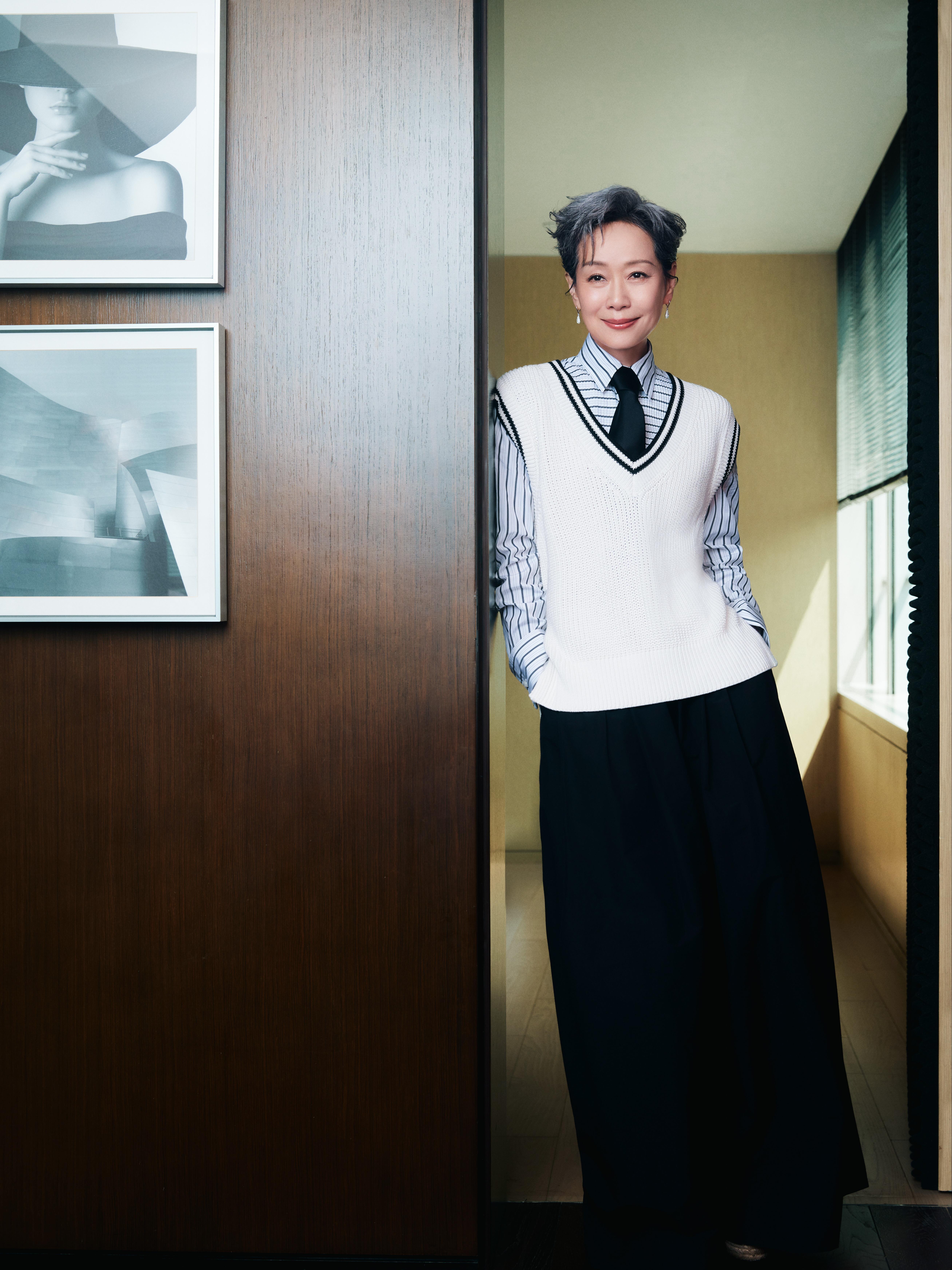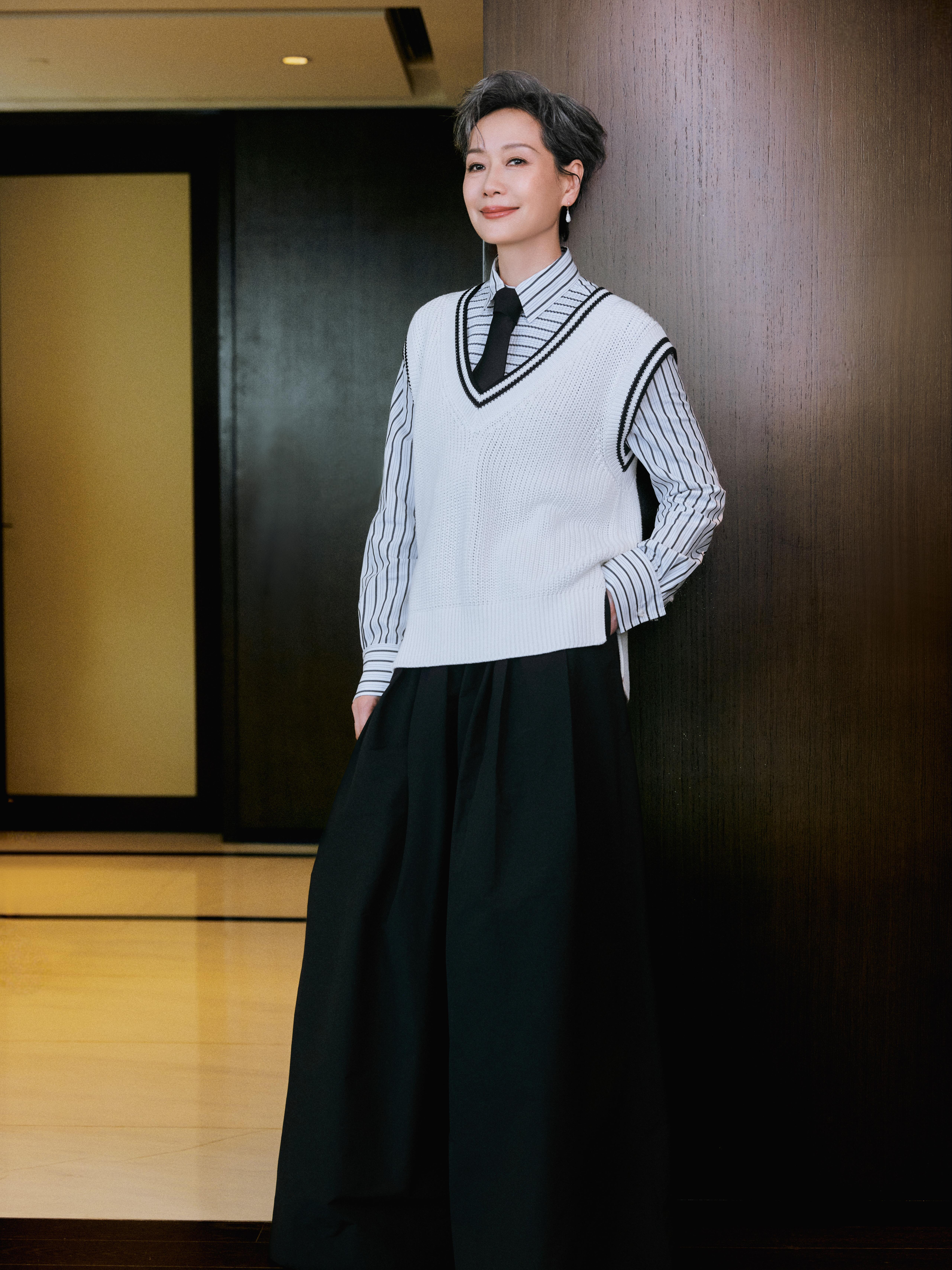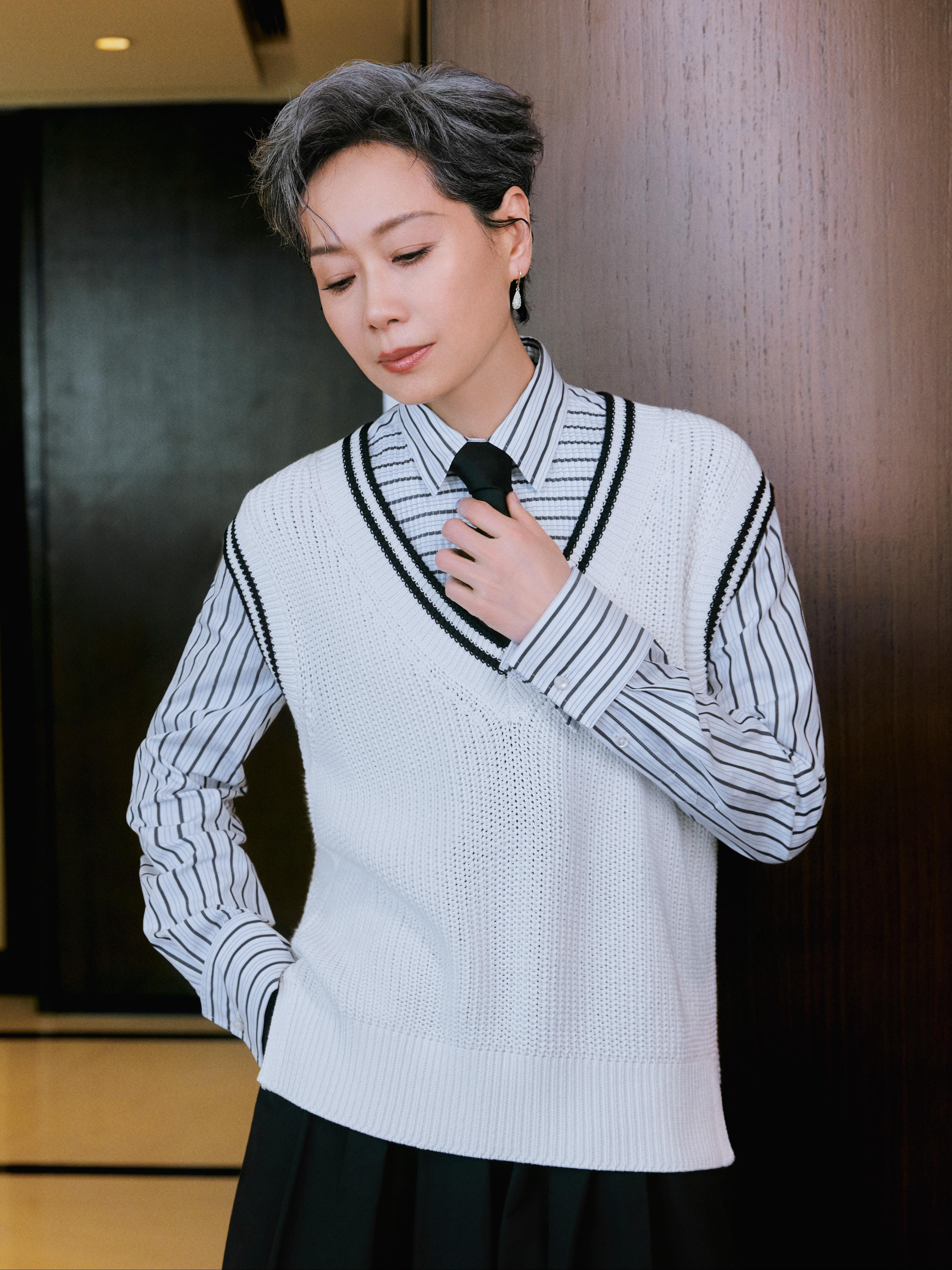 条纹衬衫叠穿镂空针织马甲,利落领带点缀细节,搭配标志性银发,将复古格调与自在活力完美融合,可谓尽显岁月沉淀的雅致与自信!独属于拉夫劳伦服装的经典魅力在此刻悄然迸发。