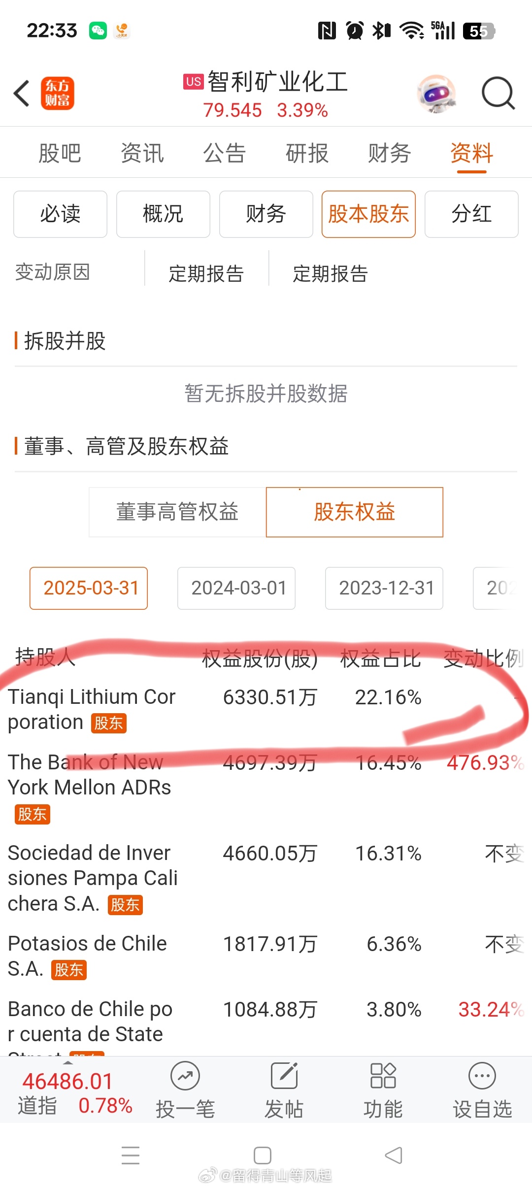sqm今晚继续大涨,天齐锂业 sz002466[股票]对sqm的持股市值已经去到