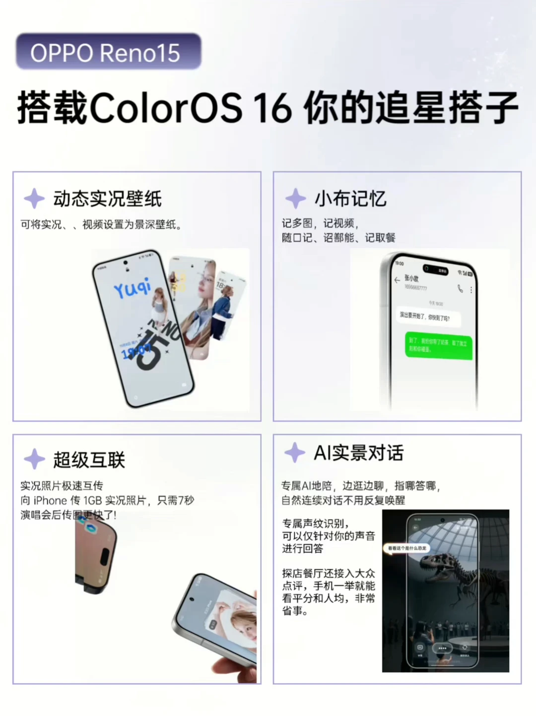 还搭载了超流畅的ColorOS 16,机圈德芙超丝滑,还有动态实况壁纸,小布记忆,超级互联,还有AI实景对话等超多好玩功能。