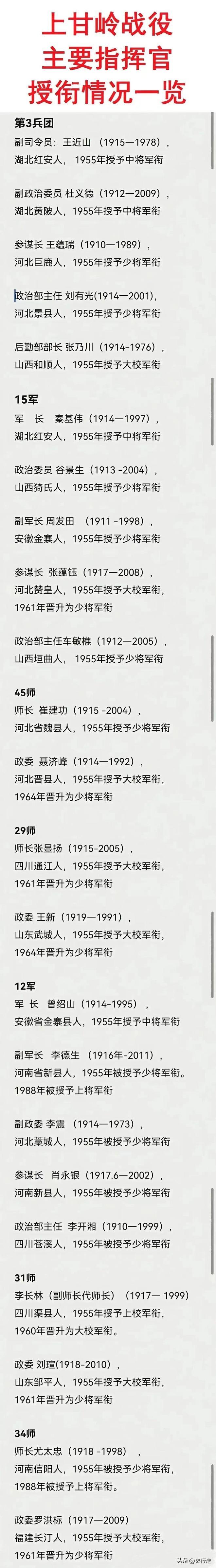 谁指挥了上甘岭战役?秦基伟,还是李德生?如图所示,当时彭总已经回国,志愿军代司令员是邓华上级,参加上甘岭战役的部队是志愿军第三兵团。第三兵团司令员陈赓也已经回国。所以当时的指挥员是副司令员王进山中将。15军是担任主攻,12军是助攻。所以要说是谁指挥了上甘岭战役,那么从上到下依次是:邓华上级、王进山中将、秦基伟中将。 上甘岭这场仗,后来常被说成一道人名题。 有人说秦基伟,有人扯上李德生,也有人认定王进山才是关键。说到最后,像在争一个“头功”。可真把当年的指挥链摊开,这事并不玄。上甘岭不是谁一个人拍桌子打下来的,可每一层指挥各管什么,位置都很分明。把这条线捋顺,许多争论就散了。 一九五二年十月,上甘岭战役爆发。那时彭总已经回国,志愿军在朝鲜的总盘子,由邓华代理掌握。这个位置,决定的是全局,是战役层面的统筹。参战部队属于第三兵团,陈赓已经回国,兵团这一层实际主持指挥的是副司令员王进山。再往下,顶在上甘岭前沿硬扛的主力,是十五军,军长正是秦基伟。顺着这个层级往下看,事情就清楚了。邓华管总局,王进山抓兵团,秦基伟在军一级直接处置阵地攻防。要问谁指挥了上甘岭,硬把一个名字拎出来,都不准确。可若一定要把顺序排明白,也只能这么排。 很多人记住秦基伟,不是偶然。 他在这场仗里确实压着最吃劲的一段。后来回想上甘岭,他说这是自己一生中最残酷的战役。这个评价并不轻。他打过河西走廊,熬过太行山,也见过中原和淮海那样的大仗恶仗,尸山血海不算陌生。可到了上甘岭,他还是把“最残酷”三个字扣在这里,分量一下就出来了。 上甘岭地方不大,五九七点九高地和五三七点七高地北山加起来,才三点七平方公里。可它偏偏长在五圣山南面,像一枚钉子,钉在朝鲜中部。志愿军守住这里,就能俯瞰金化、铁原、平康一带,稳住中部防线。美军若把它啃下来,就可能把口子撕开,连谈判桌上的气势都要跟着变。那阵子板门店谈判正僵着,美方代表哈里逊嚷过一句,让枪炮来说话。美国国内又碰上总统竞选,杜鲁门也想从朝鲜战场捞点资本。仗打到这一步,阵地已经不只是阵地。 范佛里特原先想得很轻,用两个营,五天,伤亡二百人,就拿下上甘岭。 结果战斗拖成四十三天,双方投入十多万人。“联合国军”六万余人,志愿军四点三万余人,小小山头,硬是打成了战役规模。火力更吓人。双方集中了四百三十八门大炮,“联合国军”一百零五毫米以上火炮三百门,志愿军七十五毫米以上火炮一百三十八门。 敌军还出动三千架次飞机、一百七十辆坦克。两个小山头上,砸下炮弹一百九十万发、炸弹五千枚,最多一天三十万发,平均一秒六发。山头表面工事被削平,草木被打光,抓一把土,半把都是铁屑和弹壳。 十月十四日凌晨三时三十分,范佛里特对外宣布“金化攻势开始”。 半小时后,三百门大炮、四十架飞机、一百二十辆坦克就朝五九七点九和五三七点七猛扑过去。秦基伟被炮声惊醒,立刻进作战室判断主攻方向。守备高地的是四十五师一三五团一连、九连和八连一个排,兵力并不宽裕。战前,他把二线闲置的十五门老式炮拨给前线,多是缴获来的旧炮,射程和精度都不算好,可战场上有一门算一门。后来这些老炮真派上了用场,居高临下狠狠干敌人的火力点和散兵群,把进攻队形搅得发乱。 更见老辣的,是他对节奏的拿捏。 高地第一次失守,团里不断告急,想立刻增援。秦基伟没急着点头。他看得很准,敌人炮火正在最凶的时候,这会儿往上添兵,只会把伤亡往火里推。先顶住,先磨掉敌人的锐气,再找机会反扑。 直到傍晚,他才同意增援。 夜里,一三五团四个连配合坑道守备部队反攻,狠狠干了三个多小时,两个高地又拿了回来。第二天拂晓,敌军卷土重来,守军打退三十余次反扑,到中午才因伤亡过大退入坑道。阵地又丢了,师团干部急得坐不住,秦基伟却压住火气,判断敌人已经摸到志愿军夜间反击的路数,索性改成白天进攻,再把炮火往前推。这一变,果然奏效,高地再次夺回。 再往后,双方都杀红了眼。 “联合国军”把一八七空降团、哥伦比亚营、埃塞俄比亚营和更多韩军部队压上来,志愿军十五军也把一三三团、一三四团全部投入。前后七天,“联合国军”投入十七个步兵营、十六个炮兵营、七十辆坦克、一百多架飞机,伤亡七千零六十五人。十五军投入二十一个连,伤亡三千余人,二十一个连全部伤亡过半。很多战士把枪管打得发红,没有水降温,只能用尿顶上。 真要追问谁指挥了上甘岭,答案不该只剩一个名字。邓华在上,握的是全局。 王进山居中,抓的是兵团层面的部署。秦基伟在前,扛的是十五军这一线最硬最险的阵地攻防。把他们混成一个位置,不对。把别人硬塞进这场战役的核心指挥链,也不对。 历史不是谁嗓门大就听谁的,指挥序列摆在那里,部队隶属摆在那里,战场决断也摆在那里。 等到炮火把山削平,等到坑道里全是硝烟和血腥气,真正把命令变成阵地的,还是那些趴在焦土上不肯后退的士兵。