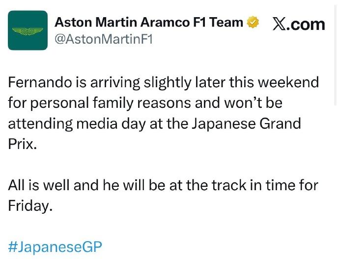 真可惜阿隆索因家庭原因(妻子临产)缺席3月26日周四的媒体日活动!但是好消息,车队官方声明其将于周五抵达日本铃鹿赛道正常参赛! 而此前,本田引擎在中国站、澳大利亚站均因振动故障退赛,一定程度影响到了阿隆索竞技状态,不知道添丁以后会不会重新冲击高分。【来自懂车帝车友圈】