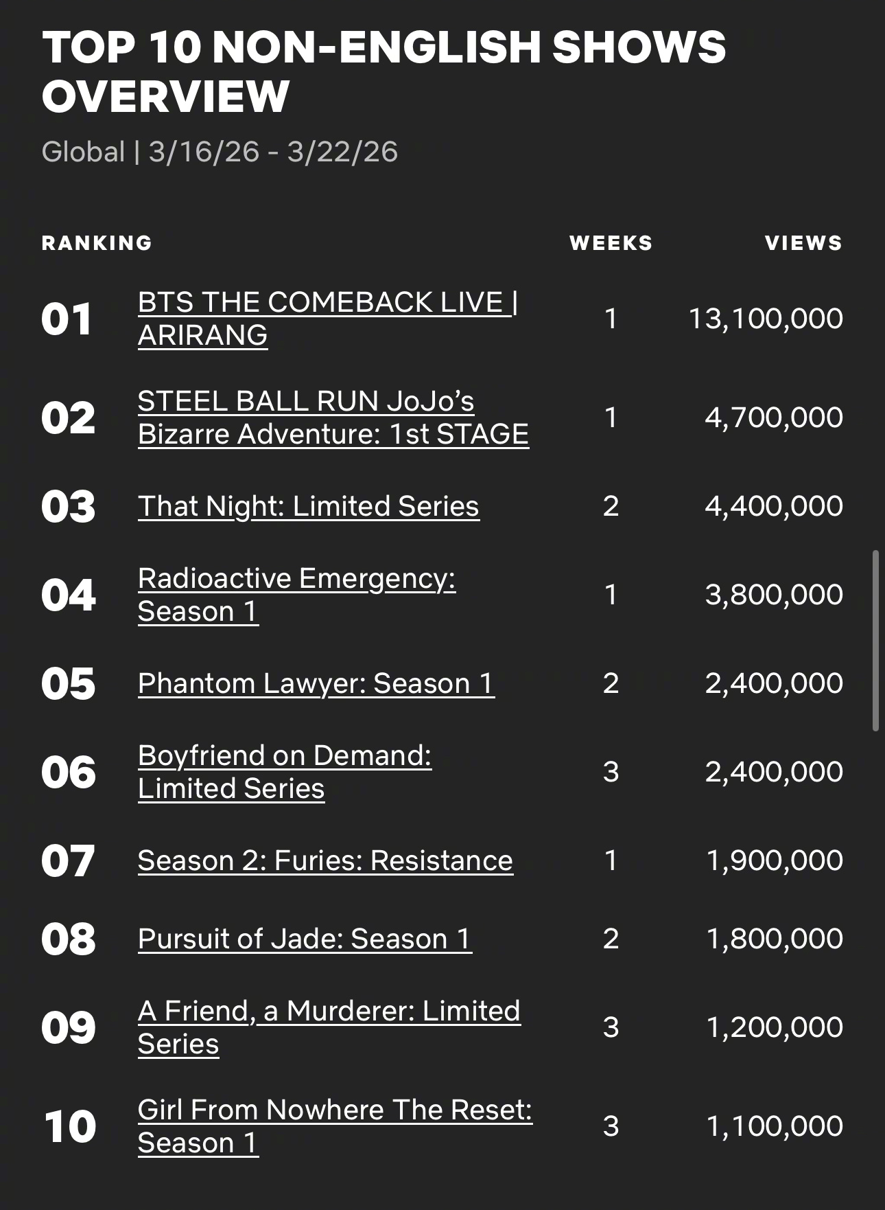 3/16~3/22 Netflix非英语区电视播放量Top10入榜韩剧5 神与律师事务所 2.4M,第2周6 订阅男友 2.4M,第3周