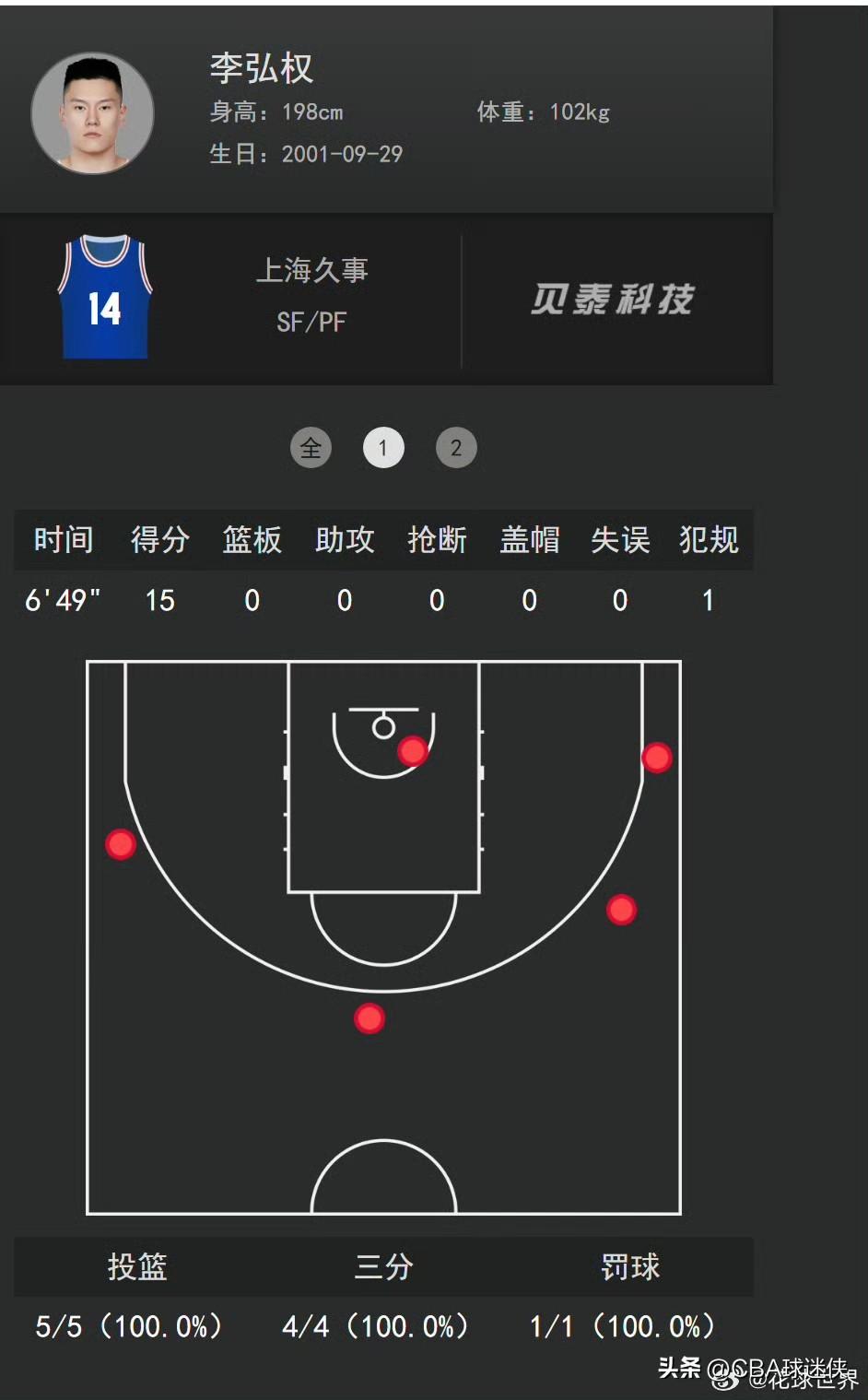 防不住?是根本挡不住!李弘权首节杀疯了! 山西队估计赛前怎么也没想到,会碰上这么一个不讲理的李弘权。 首节上来,5投5中,百分百命中率,单枪匹马砍下15分。三分球有,突破有,中距离也有,怎么投怎么有,完全无视防守。 山西队换谁防都不好使,眼睁睁看着他一个人把分差拉开。 单节百分百命中率轰下15分,这是什么神仙球?今晚的李弘权,谁来都得喊一声“真挡不住”!