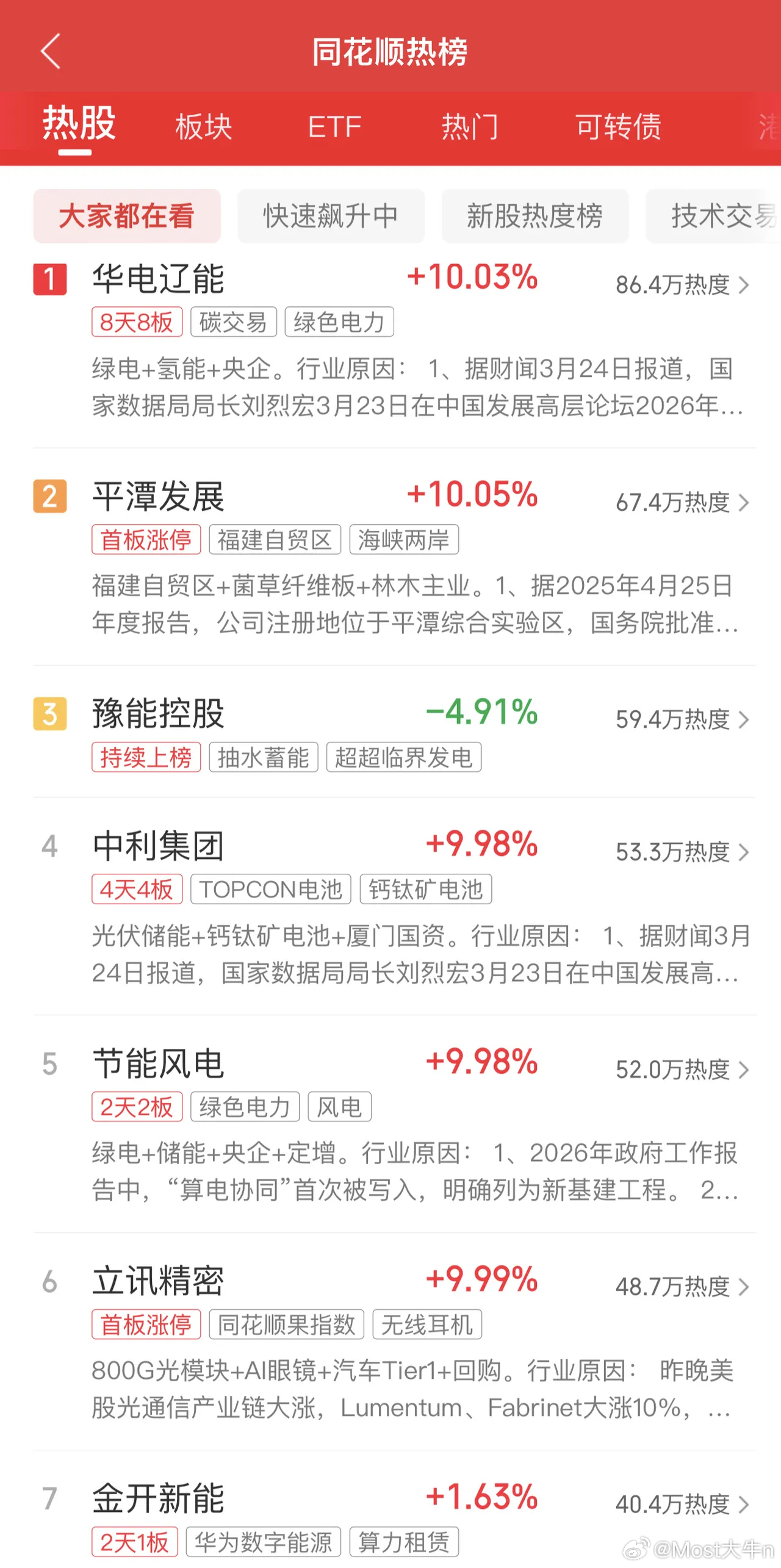 2026年3月25日,章盟主净买8.04亿,各大股吧前十热股:淘股吧: 1.美丽云 2.同花顺 3.金开新能 4.韶能股份 5.华电能源l 6.华电辽能 7.辽宁能源l 8.豫能控股 9.中利集团 10.节能风电l东财吧: 1.节能风电 2.华电辽能 3.中利集团 4.立讯精密 5.粤电力 A6.平潭发展 7.金开新能 8.韶能股份 9.浙江新能 10.中国长城同花顺: 1.华电辽能 2.平潭发展 3.豫能控股 4.中利集团 5.节能风电 6.立讯精密 7.金开新能 8.华电能源 9.长城军工 10.东方新能