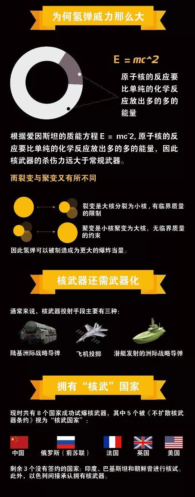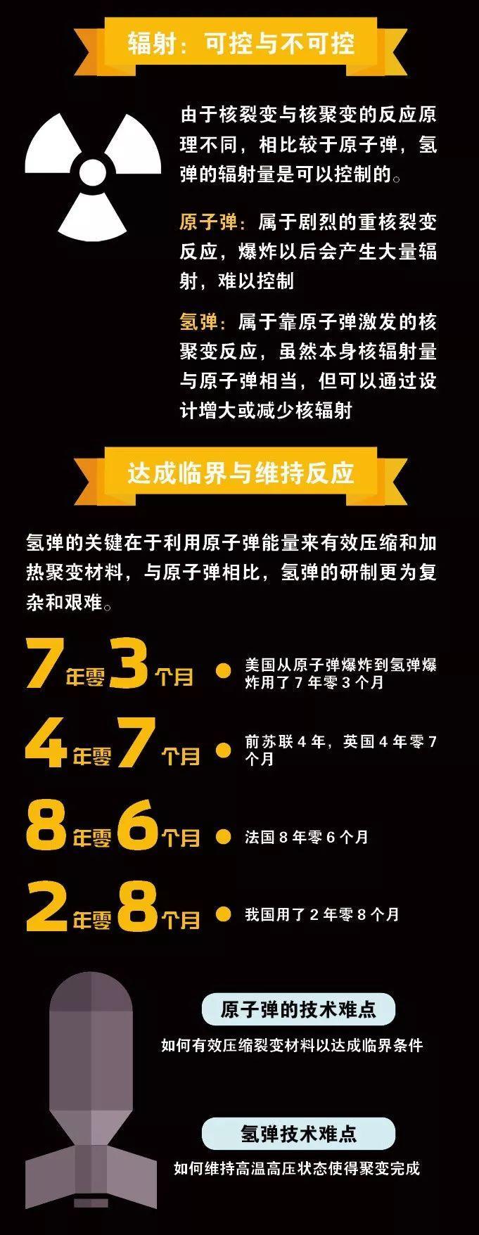 五张图片了解原子弹和氢弹的区别!保家卫国最后的杀手锏! 华闻之声新媒体联播网(撰稿 张东东)原子弹是通过核裂变反应从而释放出的巨大能量作为武器,而氢弹是通过核聚变反应释放出的巨大能量作为武器。 为什么要先有原子弹才有氢弹? 那是因为氢弹的核聚变反应需要以原子弹核裂变产生的巨大能量作为媒介才能使氢弹发生核聚变反应。所以联合国五大常任理事国美国、俄罗斯、中国、英国、法国都是在拥有原子弹后才造出氢弹的。 55年前的1964年10月16日,火球翻滚,蘑菇云冉冉升起,我国第一颗原子弹爆炸成功了。半个多世纪过去,西北大漠上空的蘑菇云早已消散,曾经为我国第一颗原子弹的研制殚精竭虑的人们将被历史铭记。 那氢弹比原子弹的威力大得多,这个差距到底是多大?苏联在1961年试爆了一颗相当于5000万吨TNT炸药的氢弹“沙皇炸弹”。 苏联原计划是试爆相当于1.75亿吨TNT炸药的氢弹的,可是因为担心对环境污染过大所以减小至5000万吨。即便氢弹被减轻至了5000万吨TNT炸药级别,也依然相当于当年美国在日本扔下的“小男孩”原子弹威力的3846倍! 两弹一星”是指核弹(包括原子弹、氢弹)、导弹和人造卫星,它是20世纪下半叶中华民族在科技领域创建的辉煌伟业。 1999年9月18日,国家对当年为研制“两弹一星”做出突出贡献的23位科技专家予以表彰,并授予于敏、王大珩、王希季、朱光亚、孙家栋、任新民、吴自良、陈芳允、陈能宽、杨嘉墀、周光召、钱学森、屠守锷、黄纬禄、程开甲、彭桓武“两弹一星″功勋奖章,追授王淦昌、邓稼先、赵九章、姚桐斌、钱骥、钱三强、郭永怀“两弹一星″功勋奖章(以上排名均以姓氏笔画为序)。 致敬两弹一星元勋。 图片来源:中国科学技术馆 同步分发华闻之声CNS新媒体联播网聚合媒体 责任编辑:胡宇春