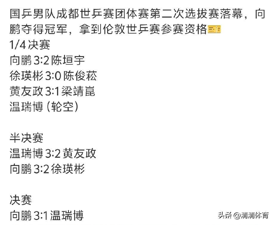 向鹏,这是终于等到属于自己的春天了吗? 成都国乒男队二次选拔赛,他一路硬战封神、强势突围。 1/4决赛3:2险胜陈垣宇,生死局咬牙过关; 半决赛再遇苦战,3:2逆转徐瑛彬,大心脏顶住压力; 决赛稳扎稳打,3:1击败黑马温瑞博,拿下冠军,稳稳锁定伦敦世乒赛参赛门票。 不得不说,这次队内选拔赛,向鹏打得挺硬[奸笑]