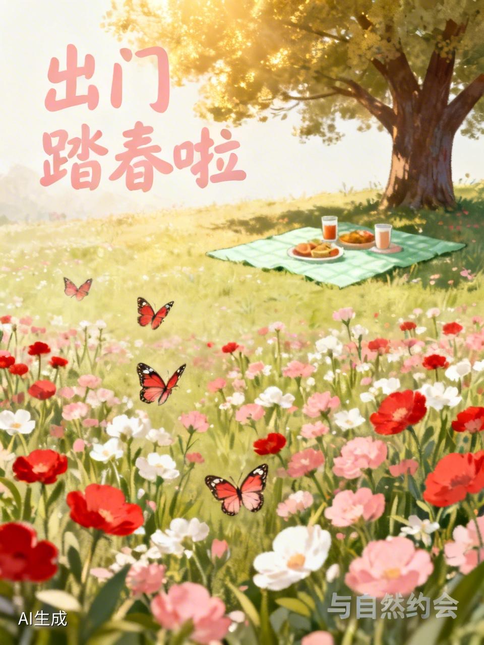 出门踏春啦,这简直是春天最棒的事儿!上周我去了郊外的一片花海。一到那儿,满眼都是五彩斑斓的花朵,红的像火,粉的像霞,白的像雪。空气中弥漫着甜甜的花香,让人忍不住深呼吸。我沿着小路漫步,身旁还有蝴蝶在翩翩起舞。看到有小朋友在花丛中追逐嬉戏,笑声清脆悦耳。在一棵大树下,我铺上野餐垫,吃着美食,晒着太阳,别提多惬意了。踏春就是一场和大自然的浪漫约会,能让人把烦恼都抛到九霄云外,大家也赶紧出门感受这春日的美好吧!