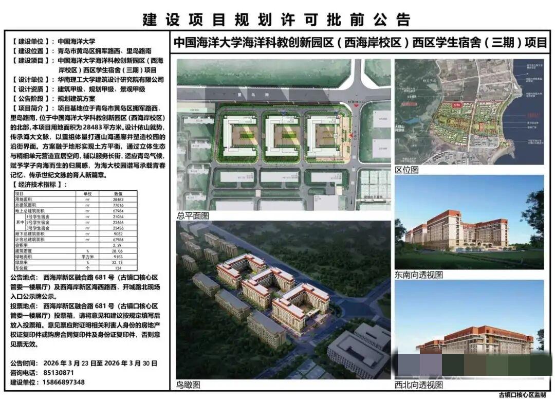 近日,青岛市西海岸新区古镇口核心区规划建设局发布了中国海洋大学海洋科教创新园区(西海岸校区)水产科技楼和西区学生宿舍(三期)规划建筑方案的公告。水产科技楼项目位于黄岛区高峪路北、融合路以东,用地面积19369㎡,总建筑面积52347㎡,容积率1.944,建筑密度35.01%,绿地率20.01%,停车位111个。西区学生宿舍(三期)位于拥军路西,里岛路南,项目用地面积为28483㎡,总建筑面积77016㎡,包括3栋学生宿舍,绿地率32.13%,车位124个。