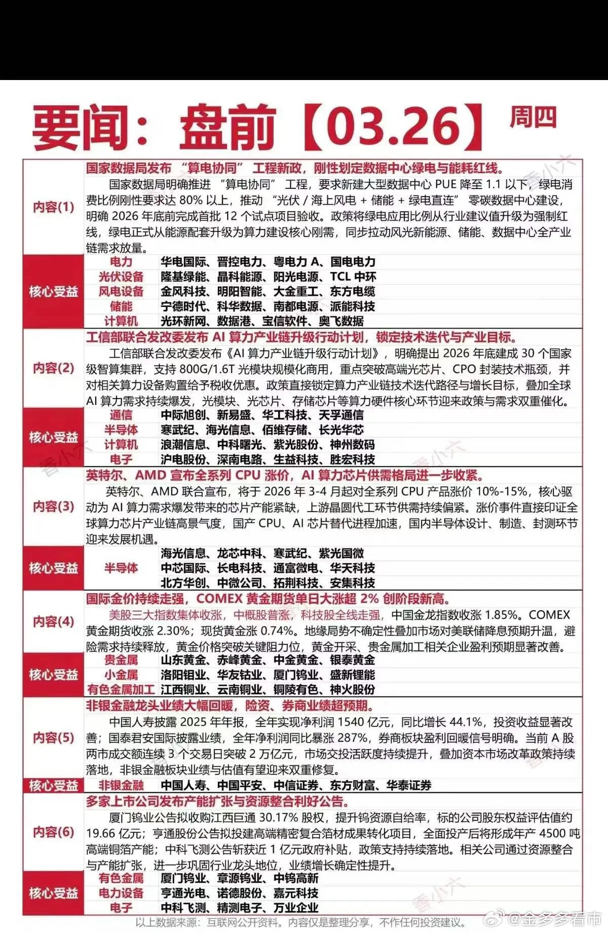 3月26日盘前要闻全景解析:多事件驱动下核心受益股Top20梳理本次盘前要闻涵盖6大核心事件,包括算电协同工程强制绿电要求、AI算力产业链升级计划、海外芯片涨价、金价走强、非银金融业绩回暖及上市公司资源整合,覆盖电力、新能源、半导体、贵金属、金融等多赛道,形成政策与事件共振的投资机会,各板块核心标的将直接受益。核心受益股Top20梳理分析1. 华电国际:受益算电协同绿电比例强制要求,作为火电龙头积极转型风光新能源,推进绿电直连数据中心业务,将享受能源结构优化与算力基建双重红利。2. 阳光电源:受益算电协同光伏+储能+绿电直连政策,全球光伏逆变器与储能系统龙头,将受益于零碳数据中心建设带来的光伏与储能设备需求增长。3. 金风科技:受益算电协同风电+储能+绿电直连政策,国内风电整机制造龙头,深耕风电设备与运营,将受益于海上风电与零碳数据中心配套的风电装机需求。4. 宁德时代:受益算电协同储能+绿电直连政策,全球动力电池与储能龙头,储能业务布局广泛,将受益于数据中心配套储能需求爆发与新能源消纳能力提升。5. 光环新网:受益算电协同数据中心建设政策,主营IDC与云计算服务,推进绿电数据中心布局,将受益于PUE强制红线要求下的零碳数据中心改造需求。6. 中际旭创:受益AI算力产业链升级政策,主营800G/1.6T光模块,全球算力网络核心设备供应商,将受益于光模块规模化商用与AI算力需求爆发。7. 寒武纪:受益AI算力升级与国产替代政策,主营AI芯片,聚焦云端与边缘端智能芯片,将受益于高端光芯片、CPO技术突破与国产AI芯片替代加速。8. 浪潮信息:受益AI算力产业链升级政策,国内AI服务器龙头,深度绑定算力需求,将受益于国家智能算力集群建设与AI算力设备购置税收优惠。9. 沪电股份:受益AI算力产业链升级政策,主营高端PCB产品,算力硬件核心材料供应商,将受益于AI服务器与算力设备需求增长带来的PCB订单提升。10. 海光信息:受益英特尔AMD涨价带来的国产替代机遇,主营CPU与AI芯片,具备自主可控技术,将受益于国内算力芯片替代进程加速与供应链安全需求。11. 中芯国际:受益英特尔AMD涨价与国产半导体政策,国内晶圆代工龙头,覆盖成熟与先进制程,将受益于国内芯片设计、制造环节产能扩张与国产替代需求。12. 山东黄金:受益国际金价走强与避险需求,国内黄金开采龙头,资源储备丰富,将受益于金价突破关键位带来的矿产金盈利提升与资源价值重估。13. 洛阳钼业:受益金价走强与新能源金属需求,布局黄金、钴、锂等多金属资源,将受益于金价上涨与新能源电池对钴锂资源的需求增长,多业务协同发力。14. 江西铜业:受益金价走强与有色加工需求,国内铜加工龙头,同时布局黄金业务,将受益于贵金属与铜价联动上涨带来的加工盈利与资源价值提升。15. 中国人寿:受益非银金融业绩回暖与资本市场活跃,2025年净利大幅增长,作为保险龙头,将受益于市场交投活跃与资本市场改革政策落地。16. 中信证券:受益非银金融业绩回暖与资本市场活跃,头部券商,经纪与投行业务优势显著,将受益于市场成交额提升与资本市场改革带来的业务增量。17. 厦门钨业:受益钨资源整合与产能扩张,收购江西巨通提升钨资源自给率,作为钨业龙头,将受益于钨资源供给收缩与高端硬质合金需求增长。18. 亨通光电:受益算电协同与电力设备需求,主营光纤光缆与电力传输设备,将受益于零碳数据中心配套的电力传输与光通信网络建设需求。19. 中科飞测:受益半导体设备政策支持,主营半导体量测设备,获得政府补贴,将受益于国内半导体产能扩张与设备国产化替代进程加速。20. 精测电子:受益半导体设备政策支持,主营半导体检测设备,覆盖面板与半导体领域,将受益于国内半导体产能扩张与检测设备国产化需求增长。总结本次梳理的20只个股覆盖算电协同、AI算力、半导体、贵金属、非银金融等核心赛道,分别受益于政策强制要求、产业升级、事件催化或业绩改善,各标的逻辑清晰,体现当前市场多事件驱动下的结构性机会,资金将围绕高景气赛道布局,板块间存在轮动与共振可能。本文涉及资讯、数据等内容来自网络公共信息,仅供参考,不构成投资建议!