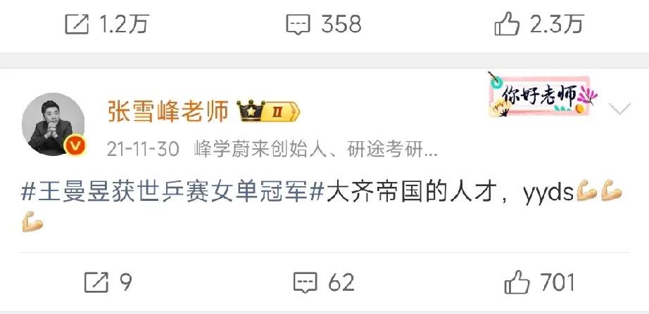 没想到:张雪峰竟是王曼昱的“铁粉”! 老张一直关注着王曼昱,每逢王曼昱夺冠,他都会发文,兴奋之情难以言说,张雪峰还说,迟早要请王曼昱代言自己公司。 如今看来,这成了他永远都不可能实现的愿望了。 张雪峰和王曼昱都来自齐齐哈尔,两人都出身平穷人家,也许是这一点,让张雪峰特别欣赏王曼昱。