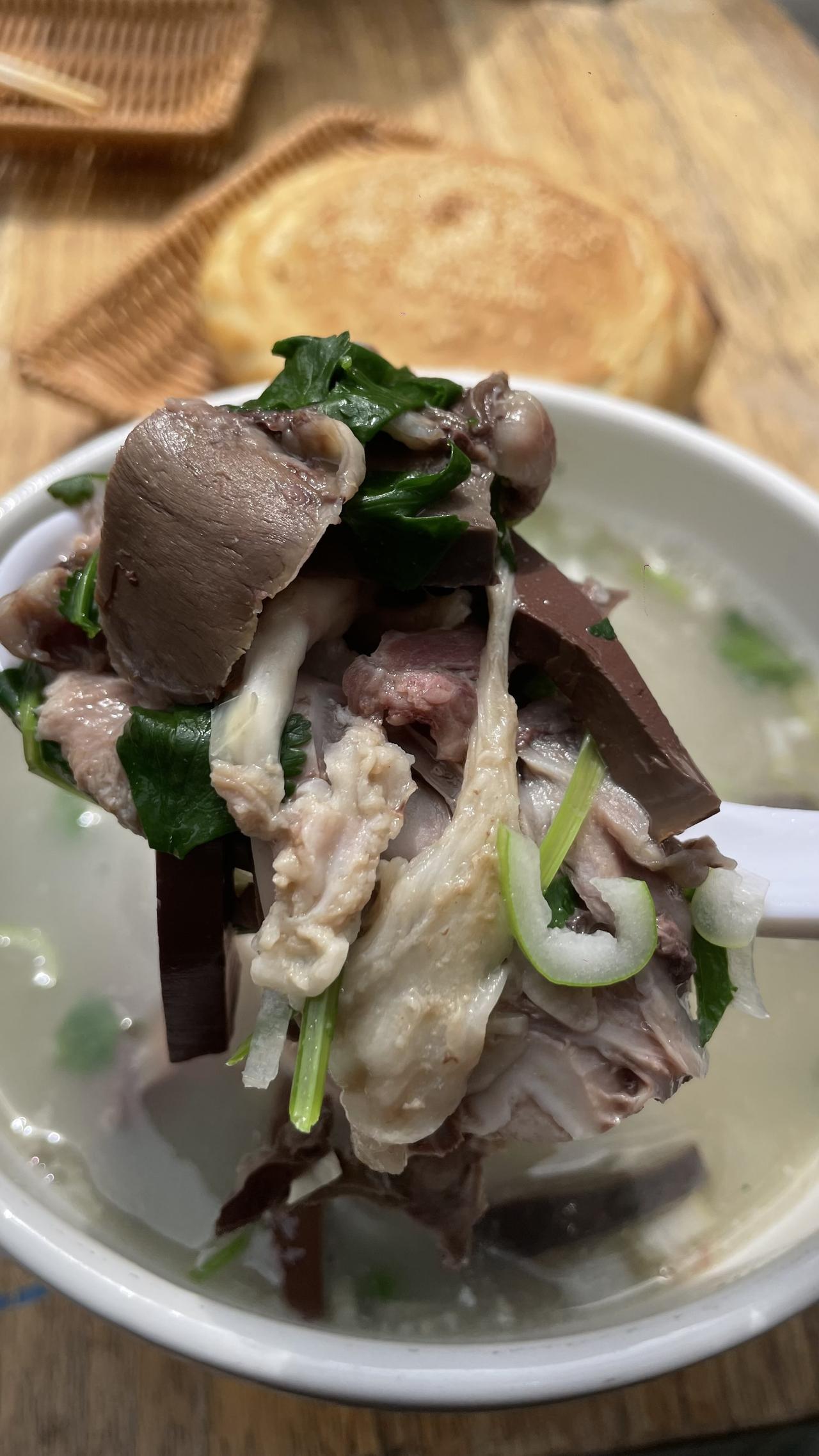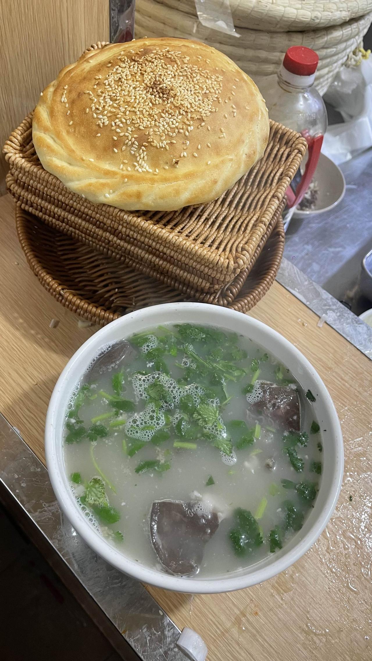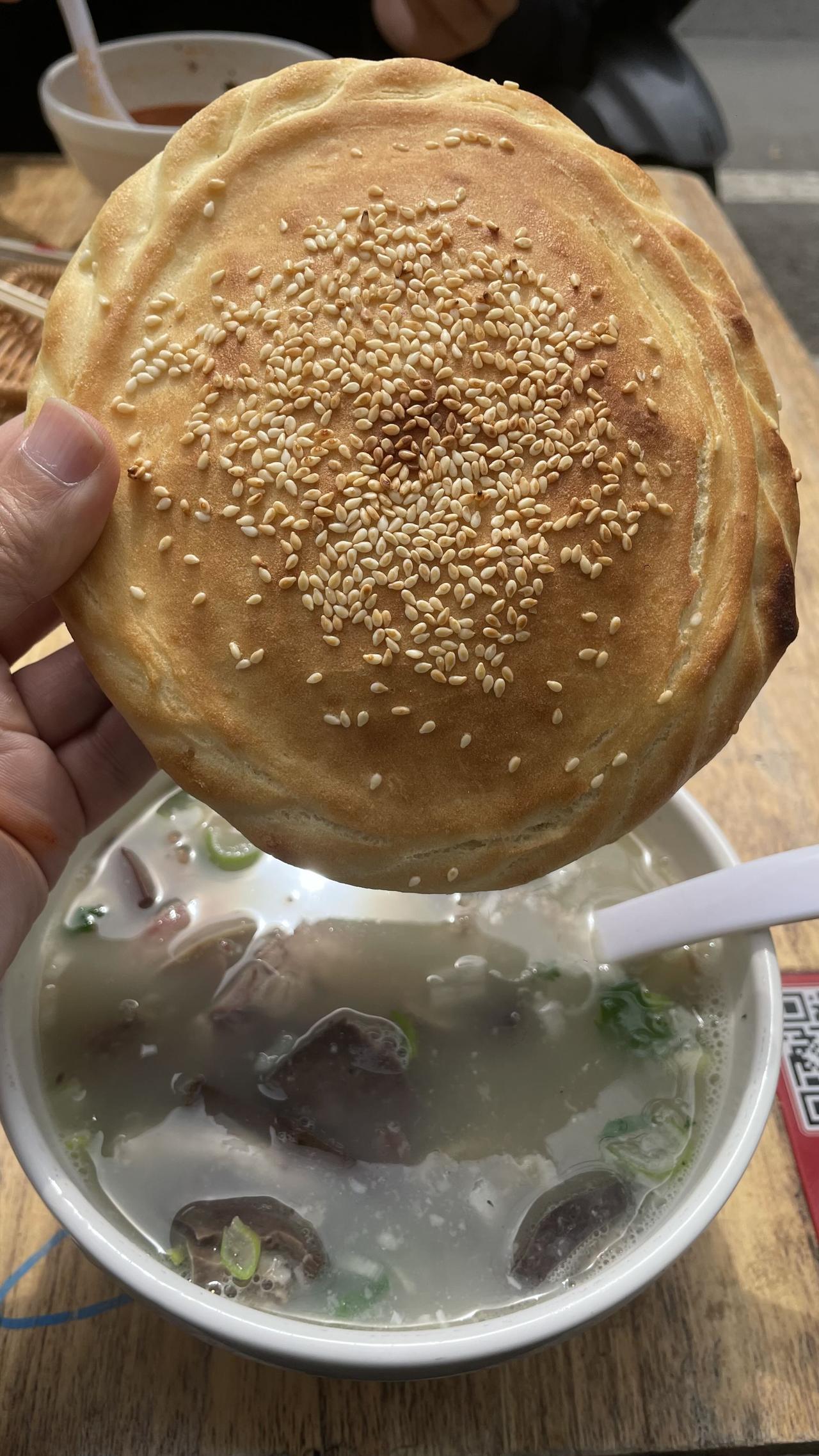 郑州汝河路与交通路,老街生活气息浓郁,新开一家羊老登卤羊肉鲜汤,每天的顾客络绎不绝,路过闻着味道香气扑鼻。 老板在窗口切肉忙碌,屋里师傅盛汤满屋飘香,要了一碗热气腾腾的羊杂汤,金黄的芝麻盖大烧饼,坐在门口喝着真是带劲。 他家的汤清香可口,喝起来并没有那么咸,半碗都是肉嚼着软烂,烧饼切着花边,味道也比较香脆,泡在碗里也好吃。 我对面来了个大爷,坐下先把锅盔掰碎,拿着一小瓶二锅头,喝着特别的尽兴。他说要想喝最美味的羊肉汤,还带早上第一锅来,那味道不一样。 郑州这家羊肉汤,对隔壁的博爱丸子汤,生意会有些影响,这家店你来喝过没?