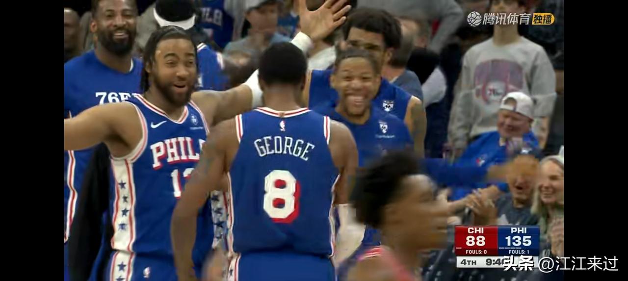 保罗乔治解禁联手恩比德同时复出,俩人合砍63分12板11助攻!俩人都憋着劲呢,这比嗑药还有用!东部黑马出现了! 76人狂屠公牛!76人其实还没有合体,他们还有马克西和乌布雷! 保罗乔治第四节已经按不住了,面对对面包夹防守,球球丝滑入网!横刀立马的那个大将军满血回归!他要复制快船战神卡的北伐事迹! 健康的76人队是东部季后赛谁都不愿碰到的对手! 纳斯很久没有打过这么富裕的仗了!第四节76人队早早上替补,乔治、恩比德联手打卡下班!