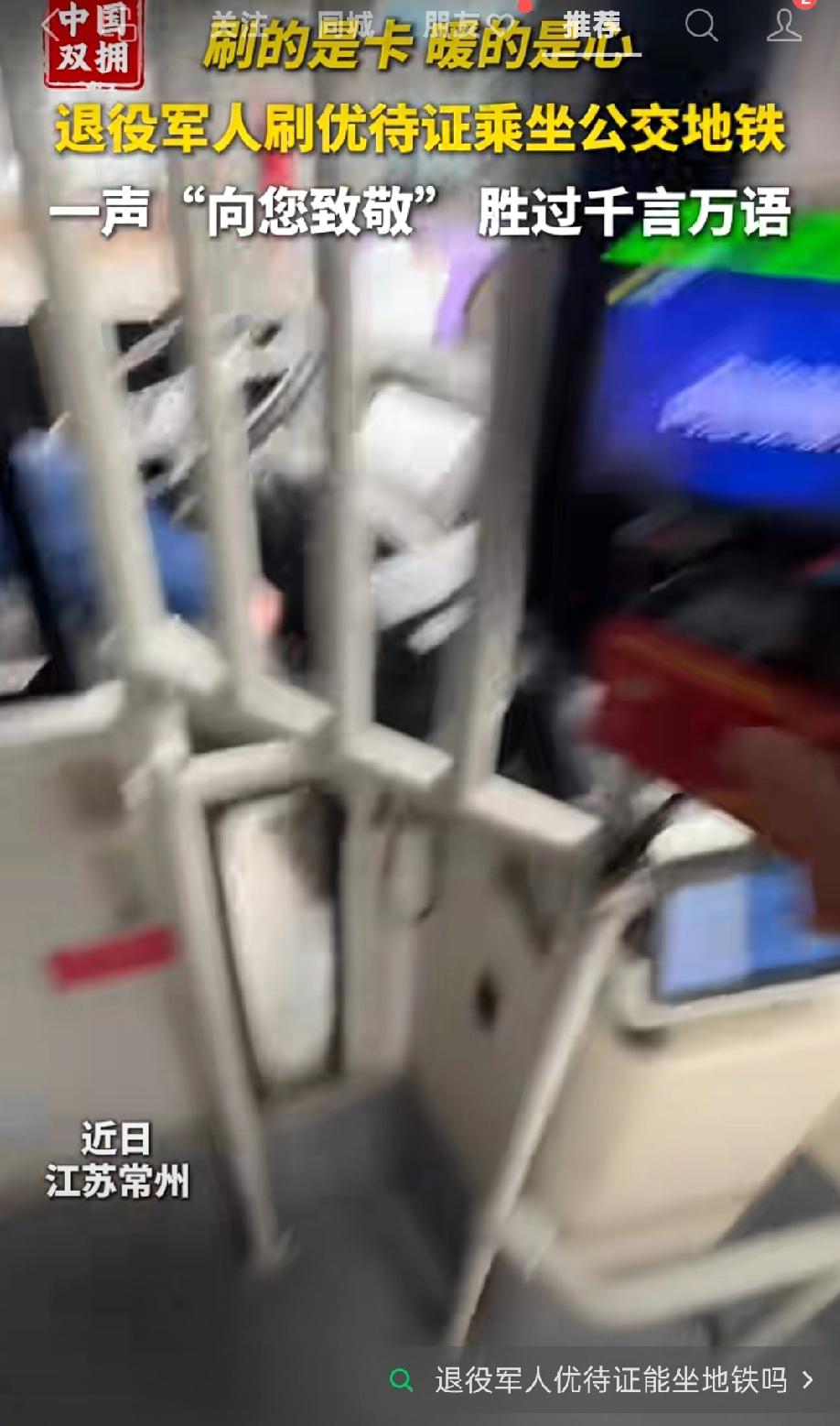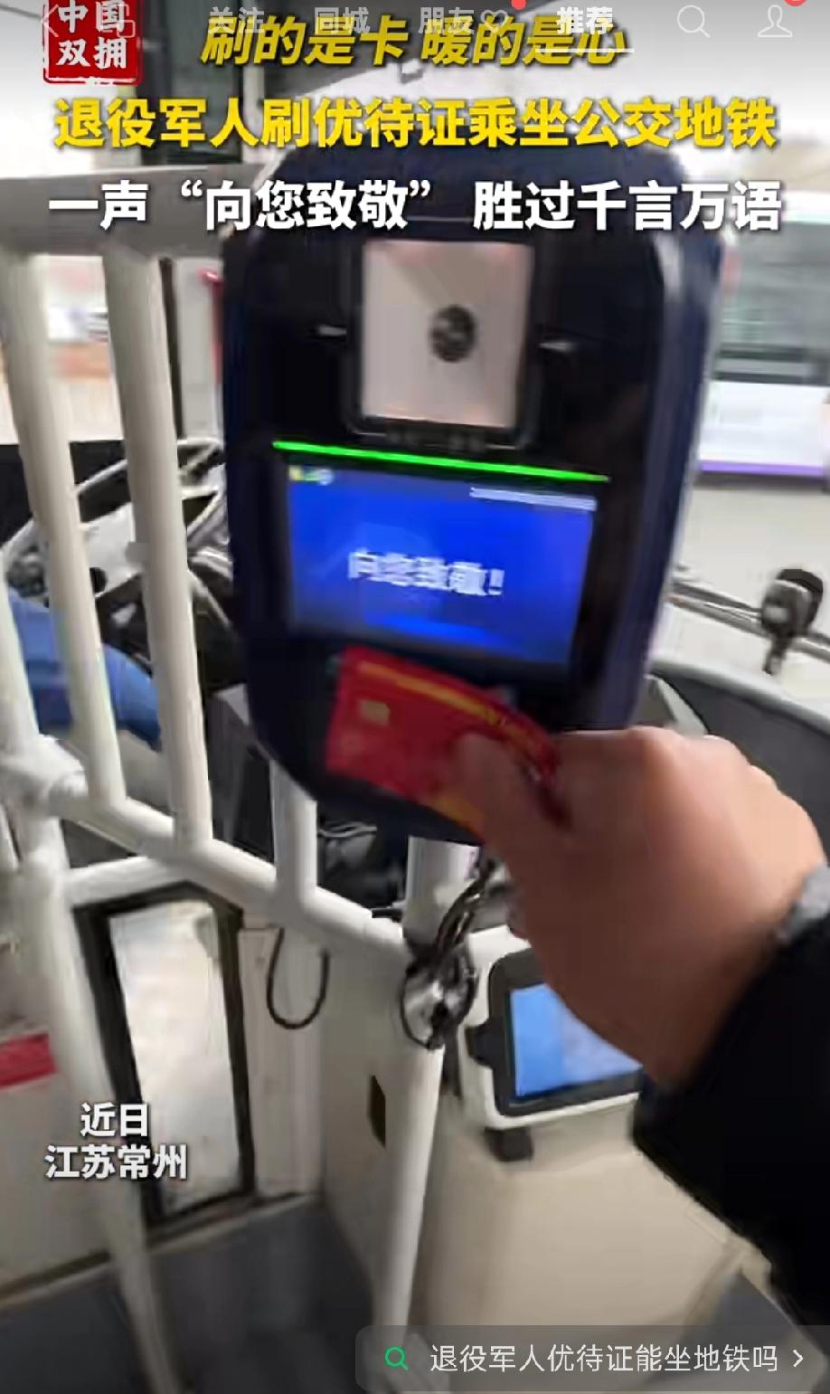 最近看到一段来自官方的短视频让我们很多退役老兵突然破防了,特别是那一声“向您致敬”,真的是胜过千言万语的表述! 虽然我们身为退役军人并不在乎一两块的公共交通费用,但是这种对于退役军人的尊敬是多少钱都买不了的,刷的是卡,但暖的是每一名退役军人的心。 相信会有很多经商成功的退役军人会选择这里经商,因为他们感受到这里对自己发自内心的敬意,记得一位商界大佬说过一句话,当资本到了一定的规模,最看重的就是那种发自内心的尊敬! 江苏常州退役军人刷优待证直接乘坐公交和地铁。退役军人 优待证