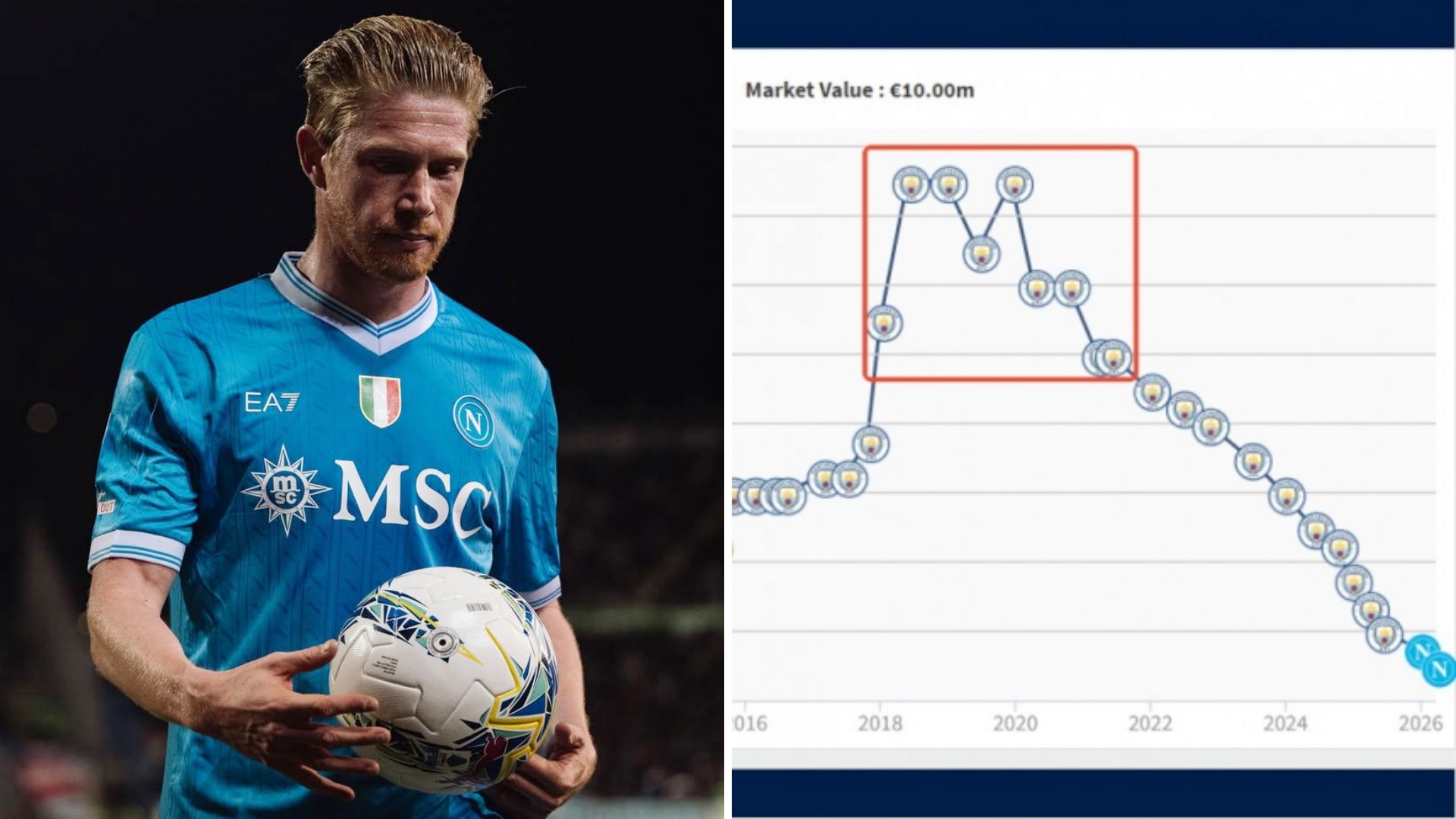 34岁的那不勒斯中场德布劳内,身价下跌500万欧至1000万欧。 德布劳内在26岁-30岁时身价超过1亿,最高达到过1.5亿欧。