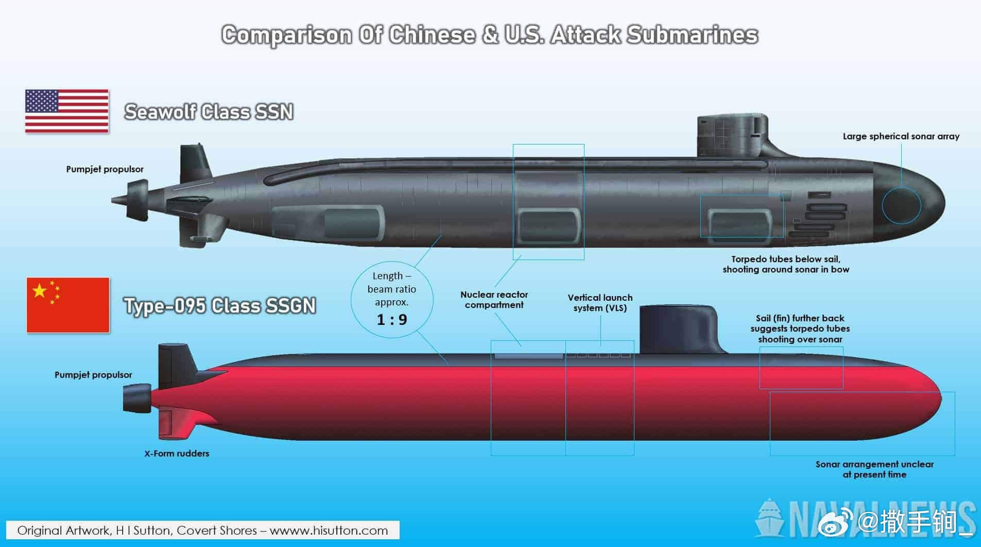 萨顿在《海军新闻》撰文说,美国海军的海狼级潜艇代表了毫不妥协的潜艇设计巅峰(即为了性能不惜代价之意),旨在主导水下战场。如今,看来中国最新的核动力攻击潜艇095型也秉持着同样雄心勃勃的理念建造,在关键方面与海狼级非常相似。海狼是一款毫不妥协的设计,从一开始就立志成为最优秀的,但这代价巨大。因此,苏联解体后,只有三艘极其昂贵的海狼级被建造,而随后的弗吉尼亚级更为廉价。随着时间推移,弗吉尼亚级能够受益于海狼号无法做到的技术进步,但海狼依然是金标准。中国也在类似的进展中,但方向相反。现役的093B型至少有四艘服役,是093系列的最新迭代发展。它配备了垂直发射系统用于巡航导弹,并略有改进的流体动力学设计,但整体上是早期093的加长版,类似于最新的弗吉尼亚级。而首艇正在建造的095型,设计全新,它更像是海狼。095型的长度并没有超过之前的093型。实际上,它可能稍微短一些。但它明显更宽,从约11米增加到约12米。这使得其尺寸几乎与海狼级相同。反直觉的是,较短且较胖的海狼号拥有比后期更为细长的弗吉尼亚级更高效的艇体设计——航速更快。095型的长宽比接近海狼。配合相对尖锐的舰首和大型X形舵,表明095型具备高速水下航行能力。095型与海狼不同的是,它在围壳后方直接安装了垂直发射系统。这使其能够携带额外的陆攻或反舰巡航导弹,可能包括DF-10A陆攻巡航导弹以及YJ-17或YJ-20高超音速导弹。095型还采用了X型舵,可能还配备了涡轮电动驱动,这些也是美国海军下一代SSN(X)的特征。随着时间推移,我们会对095了解更多。095